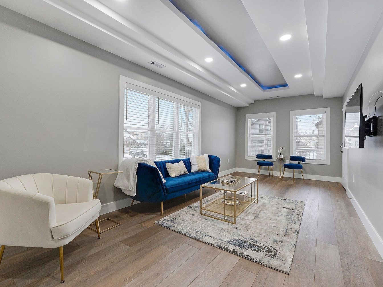 A spacious and modern living room with pale gray walls and wide plank light wood flooring. The furniture includes a royal blue velvet sofa with gold legs, an off-white modern accent chair, and two matching blue velvet chairs near the back windows. A gold and glass square coffee table sits atop a muted patterned rug, contributing to the elegant aesthetic. Large windows let in abundant natural light, and a coffered ceiling with recessed lighting adds architectural interest. The minimalistic decor, soft textiles, and metallic frames create a blend of cozy and sophisticated ambiance in this bright communal space.