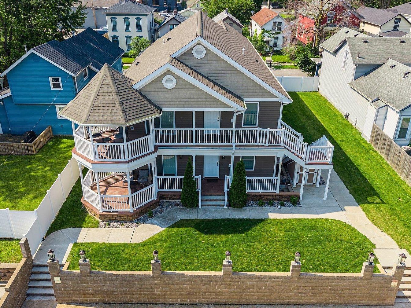 A two-story historic American home with a prominent wraparound porch and balcony, both accented by crisp white railings and trim. The facade is clad in taupe siding, pairing with gray and brown roofing for a classic look. Notable is an octagonal gazebo-style seating area attached to both porch levels, suggesting a focus on outdoor leisure. The manicured lawn and symmetrical front landscape beds are bordered by concrete walkways and a retaining wall with column lights. The surrounding neighborhood features similar historic houses, creating an inviting, cohesive streetscape. Overall, the home displays an inviting, timeless, and well-maintained aesthetic.