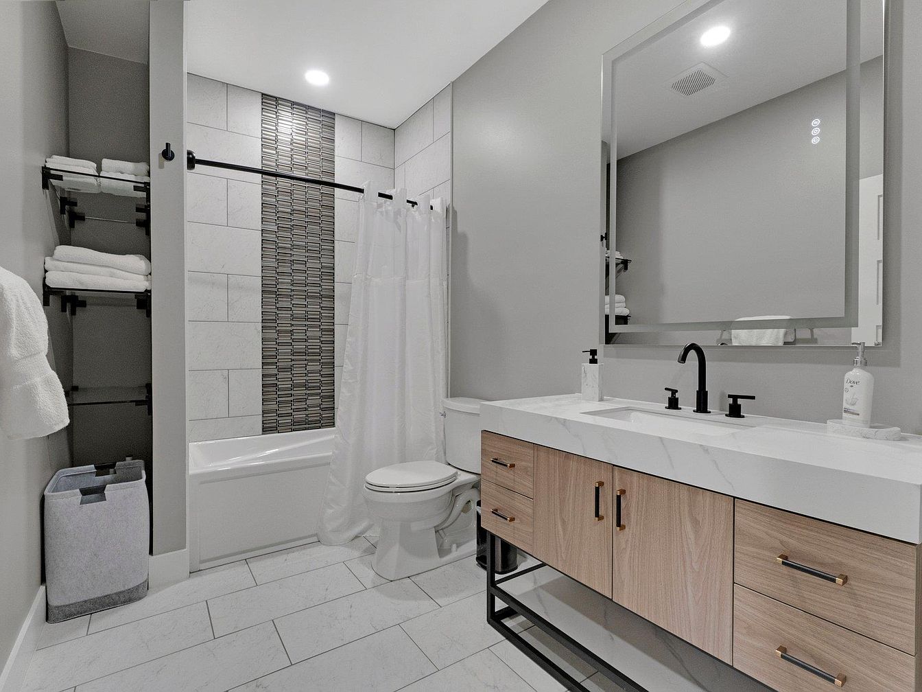 A contemporary bathroom features a spacious white countertop with dual sinks, black matte fixtures, and a large, rectangular mirror framed in silver. The floating vanity below has natural wood cabinetry and black handles, contrasting with the otherwise light palette. To the left, a modern bathtub-shower combination is accented by glossy white subway tiles and a striking vertical stripe of textured dark mosaic tile. Open shelving beside the tub holds neatly folded white towels, and a soft gray laundry bin rests below. Pale gray walls and white porcelain tile flooring complete the clean, calming aesthetic.