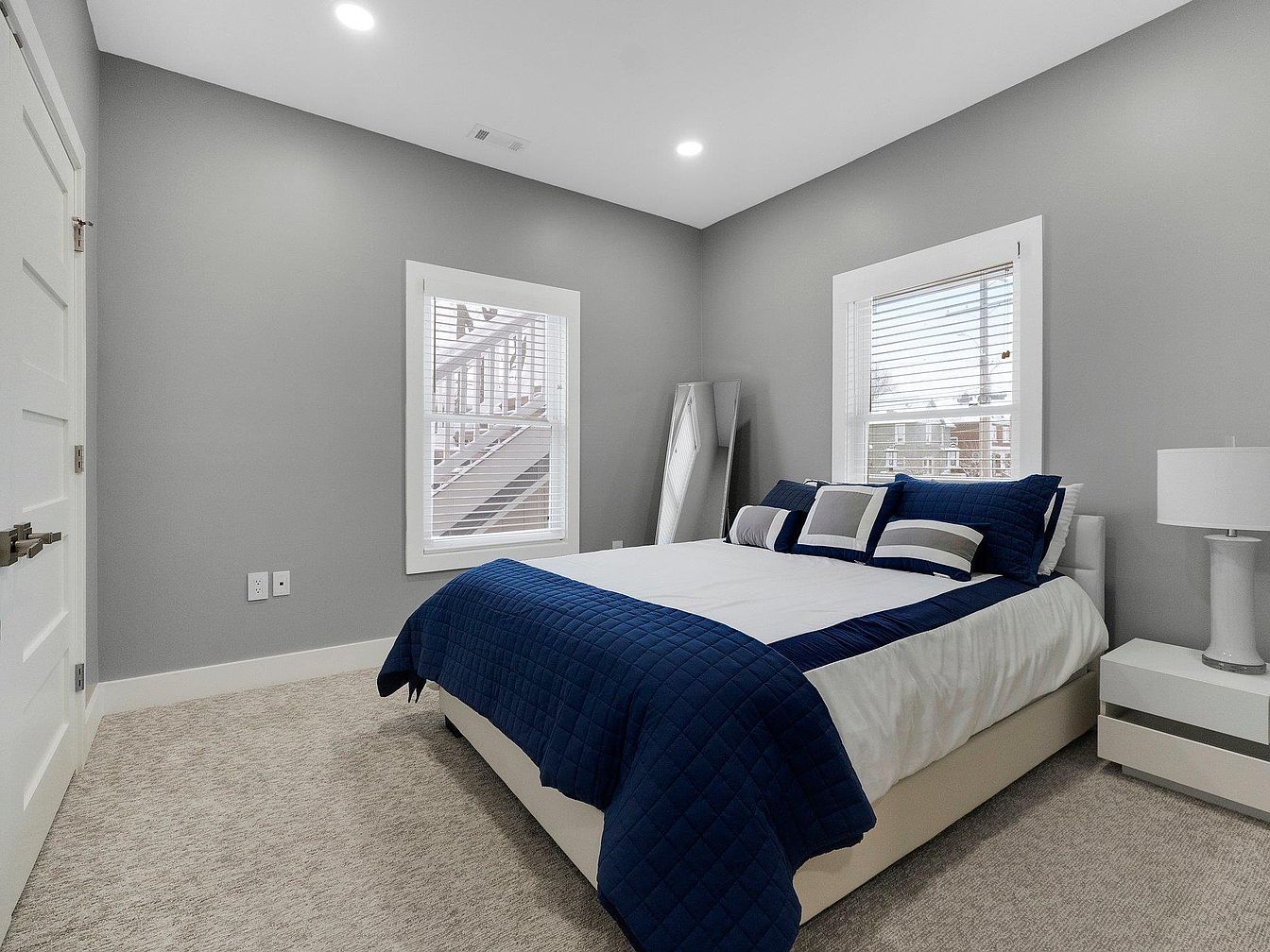 A serene bedroom features light gray walls, plush light beige carpeting, and two large windows letting in natural light. The bed, the room’s central piece, has a white frame and is dressed with a white comforter bordered in navy blue and matching navy blue pillows. A contemporary white nightstand with a sleek table lamp sits by the bed. In the corner, a tall floor mirror leans against the wall. The trim around the doors and windows is crisp white, adding contrast to the gray walls. Overall, the space feels calm and uncluttered with a minimalist, modern aesthetic.