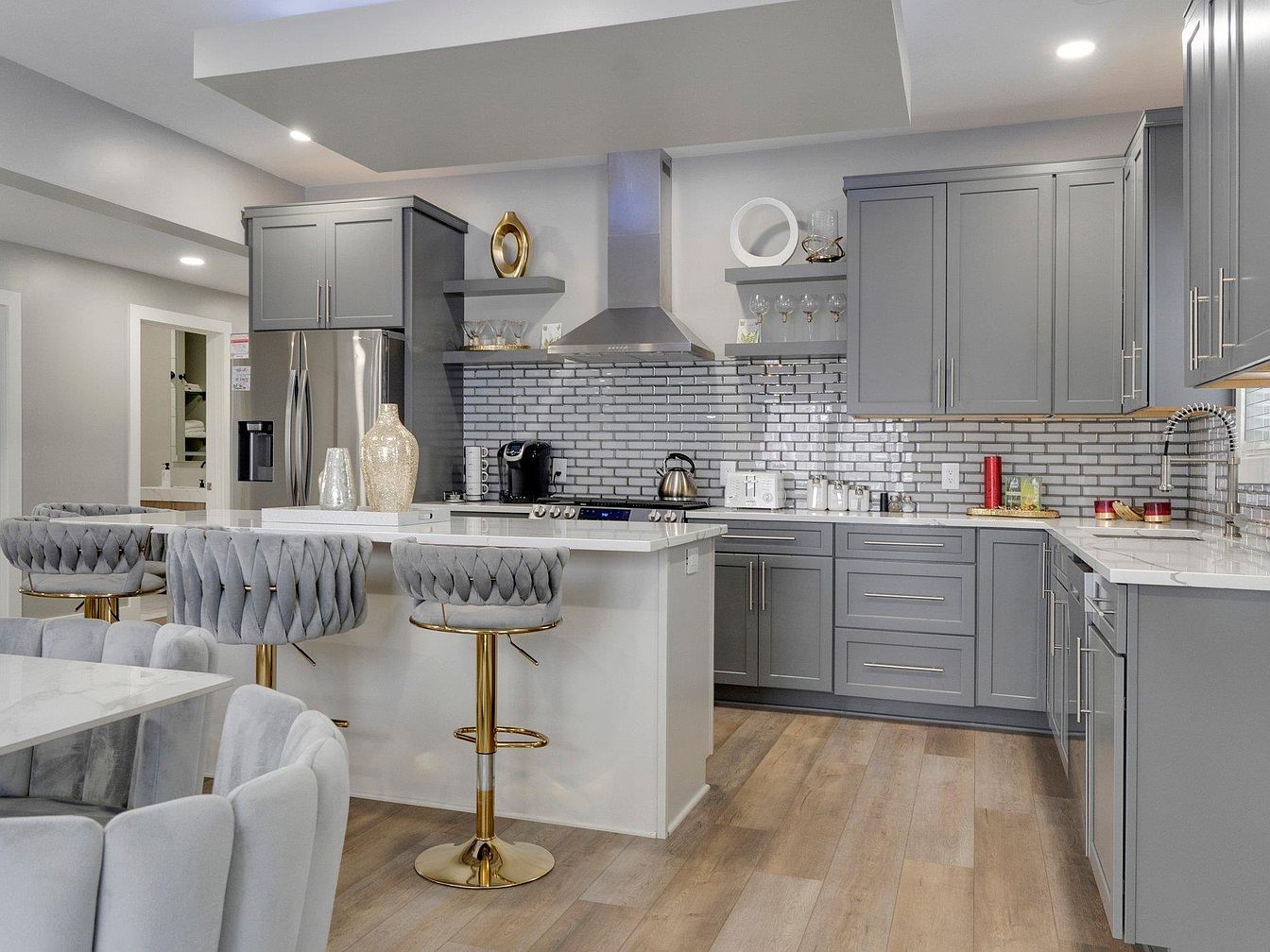 A modern kitchen featuring a spacious white island with three plush, tufted bar stools upholstered in soft gray fabric and supported by brass bases. Sleek gray cabinetry with long silver handles lines the walls, and the countertops are a crisp white. The backsplash consists of glossy, light-gray subway tiles arranged in a horizontal pattern, reflecting the recessed lighting above. Stainless steel appliances, including a refrigerator and vent hood, add a contemporary touch. Decorative vases and glassware provide accents on the counters and shelves, while the open layout leads into adjoining rooms, all unified by wide-plank light wood floors.