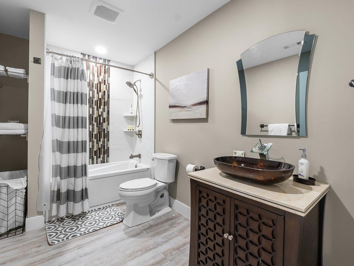 A contemporary bathroom featuring a neutral color palette with light tan walls and pale wood-look flooring. The bathtub is accented with a bold mosaic tile vertical stripe and marble-effect wall tile, paired with a white and gray striped shower curtain. Fixtures include a modern toilet and a floating glass shelf in the shower. On the right, a dark wood vanity with an ornate pattern supports a brown glass vessel sink and a sleek, modern faucet. The uniquely shaped mirror above the vanity complements the sink. Minimalist shelving holds white towels and a wire laundry basket to the left.