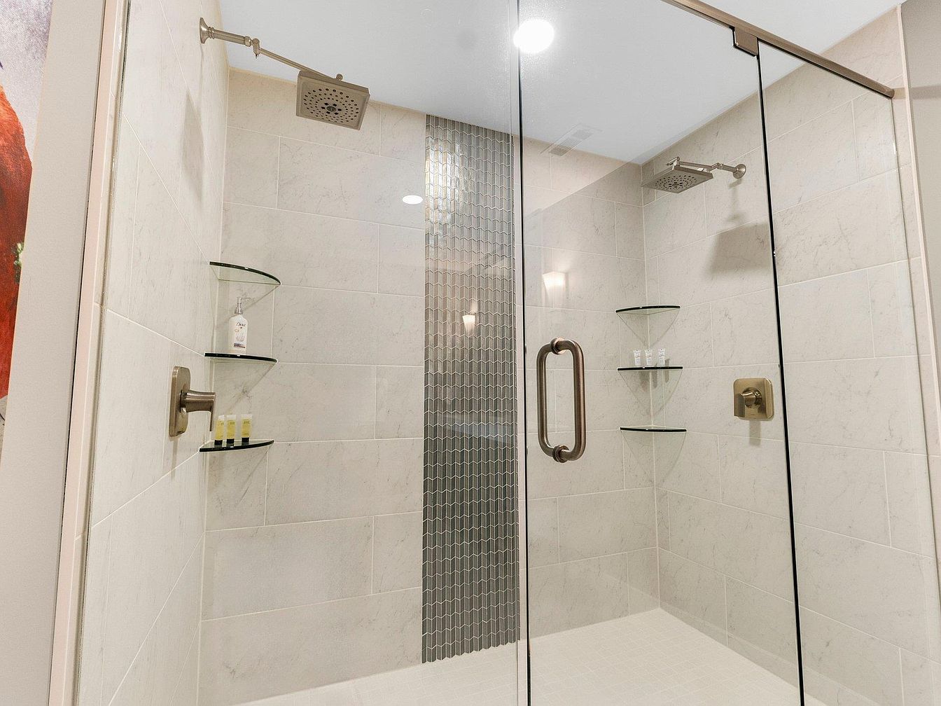 Spacious glass-enclosed shower features creamy marble-like tiles in a rectangular grid, lending a clean and modern look. Opposite metallic rain showerheads are mounted on both sides, suggesting a double shower layout. A vertical strip of dark, textured mosaic tiles runs floor to ceiling in the center of the back wall, creating a striking visual contrast. Corner glass shelves on both sides hold small toiletries and soaps, adding functional elegance. The fixtures have a brushed nickel finish, complementing the neutral palette. The overall aesthetic is sleek, sophisticated, and inviting, blending contemporary lines with subtle, luxury accents.