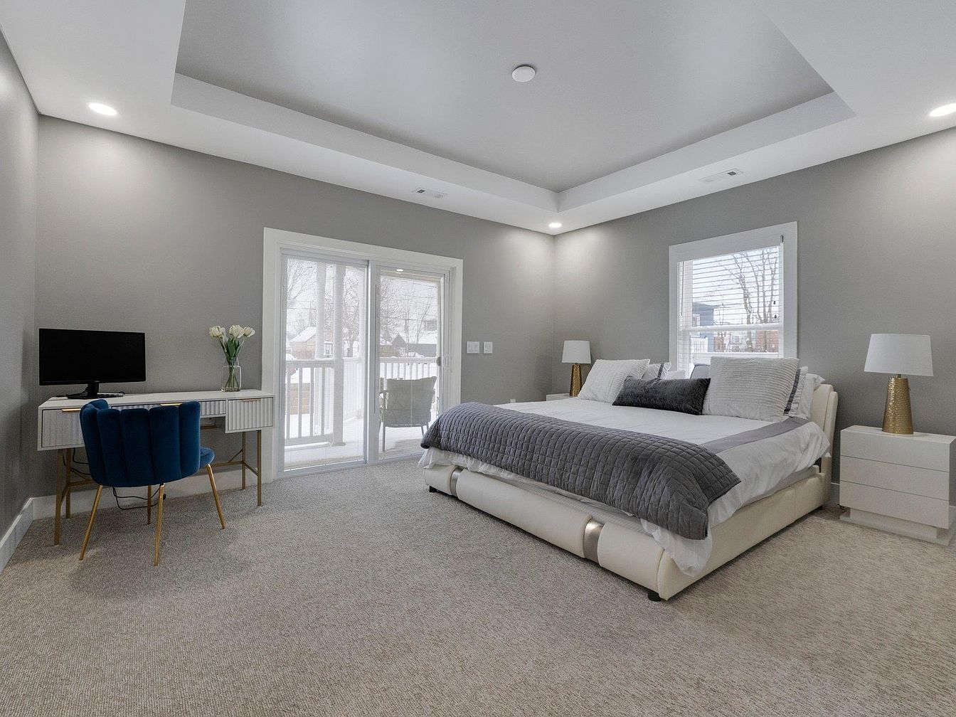 A spacious modern bedroom with a serene color palette of soft grays and whites. Plush, light carpet covers the floor, complementing the gray walls and white tray ceiling with recessed lighting. A large, platform bed is made with crisp white linens and gray accents, flanked by two white nightstands topped with gold, textured lamps. A single window brings in daylight, while sliding glass doors open to a balcony, letting in more natural light and a view outside. Against one wall is a sleek, white desk paired with a bold royal blue velvet chair and a minimalist computer monitor, along with a clear vase of tulips.
