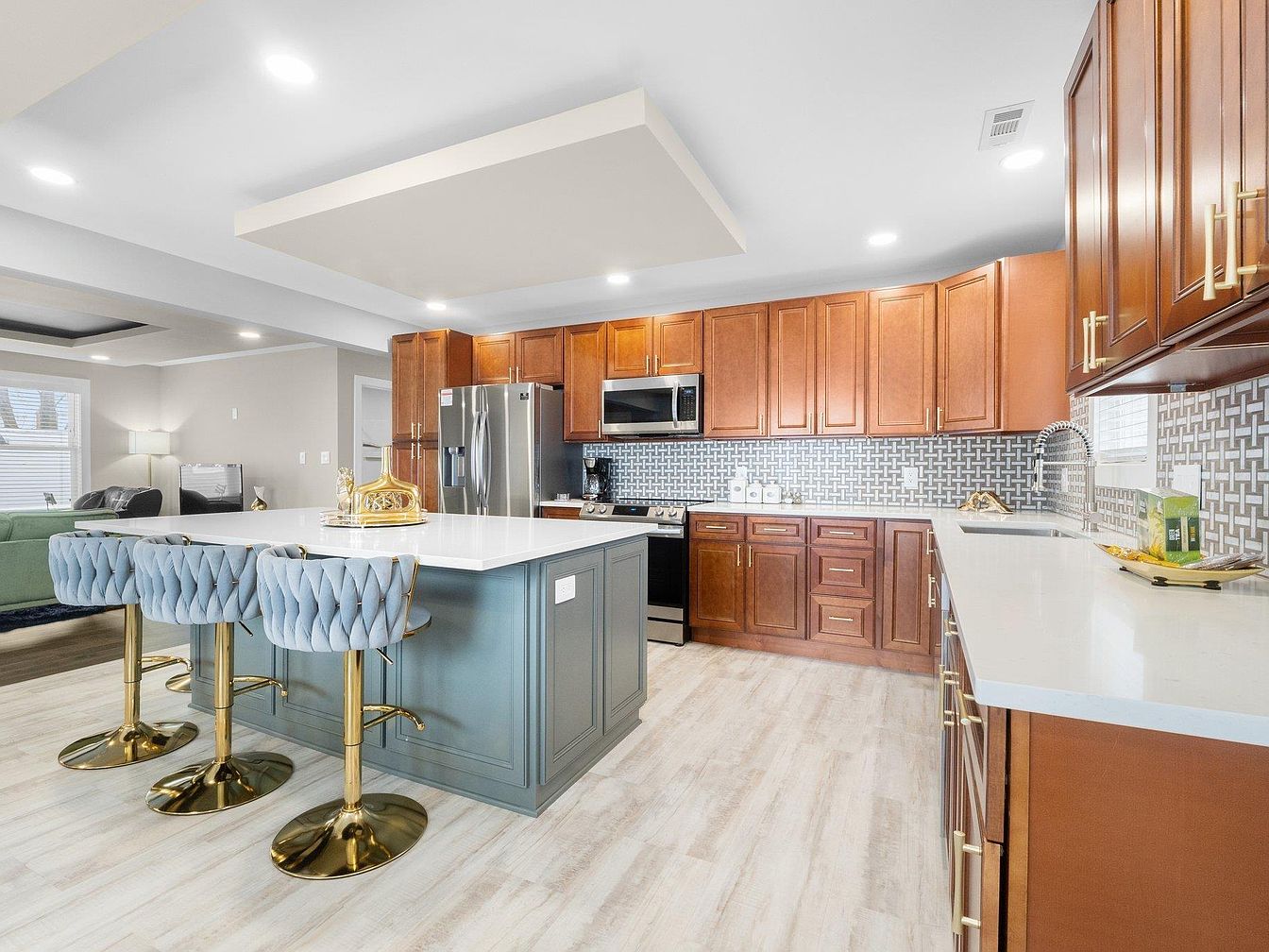 A modern kitchen featuring a central island with a light blue-gray base and a luxurious white quartz countertop. The island is surrounded by three plush, blue, tufted barstools with gold bases, adding elegance and comfort. Rich, warm wood cabinetry lines two walls, accented with sleek gold hardware, while a stainless steel refrigerator and appliances contribute to the contemporary feel. The geometric, monochrome tile backsplash adds visual interest and sophistication. Light wood flooring runs throughout the open-plan space, which seamlessly connects with an adjacent living area furnished in soft neutrals and muted green, creating a cohesive and inviting aesthetic.