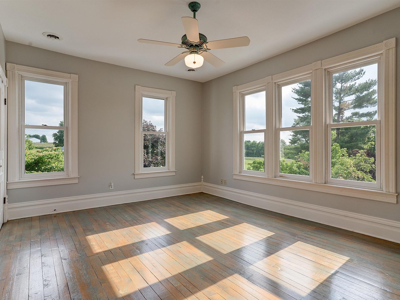 Bright corner room featuring five large windows set in white, ornately trimmed frames, filling the space with natural light and showcasing views of green landscaping and distant trees. Walls are painted a subtle, soft gray, creating a calm and airy atmosphere. The floor is wood with a slightly weathered, pale blue-green finish, adding rustic charm. A vintage ceiling fan with a central light hangs from a plain white ceiling. The simple, wide baseboards are painted white, matching the window casings, and the room feels open and inviting, ideal for relaxation or enjoying the outdoor scenery indoors.