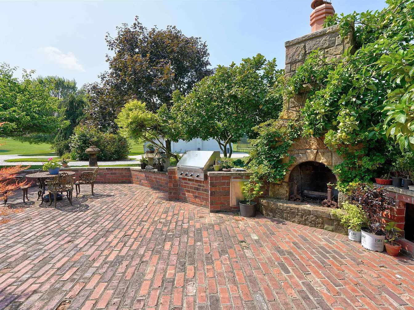 Expansive outdoor patio area paved entirely with weathered red brick laid in a herringbone pattern, giving a warm and timeless look. The space features a large stone fireplace covered in green climbing vines on the right, adding rustic charm and an inviting focal point. Sturdy iron furniture, including a round table and two decorative chairs, offers a cozy spot for relaxation. Built-in brick counters host a stainless steel grill for outdoor cooking, while potted plants and lush landscaping create a verdant, serene environment. Overhanging trees provide partial shade, blending the patio seamlessly into the surrounding garden.