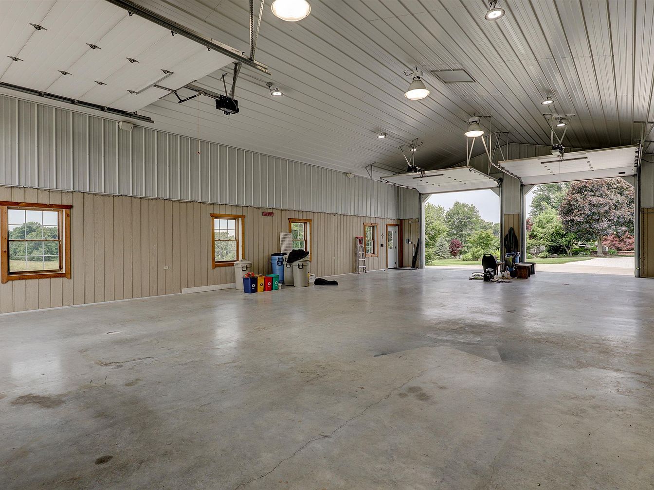 Spacious, open-concept garage with a high, corrugated metal ceiling and bright overhead lighting. The floors are polished concrete with minimal stains, contributing to the industrial yet clean atmosphere. Three wood-framed windows on one side allow ample natural light, while double wide garage doors are open to reveal a well-maintained green yard outside. Walls feature neutral beige paneling with a mid-height metal wainscoting. A few storage bins, a step ladder, and some miscellaneous items are neatly grouped against the far wall, emphasizing the utility of the space while maintaining an uncluttered appearance. Simple trim provides subtle warmth to the utilitarian look.