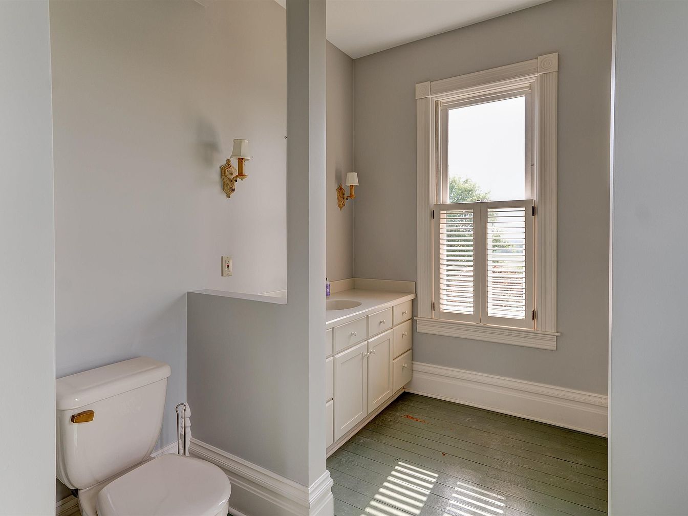 An airy bathroom space features pale gray walls and a muted sage-green wooden floor with glossy finish. A white porcelain toilet sits in a discrete nook separated by a half wall. The vanity runs under a large window and is topped with a white counter and sink, complemented by substantial white cabinetry with classic hardware. Decorative gold and white sconces add a touch of historic elegance above the vanity and beside the dividing wall. The window, trimmed in ornate white molding, allows natural light to fill the room and illuminate the subtle architectural details, evoking a sense of period charm and tranquility.