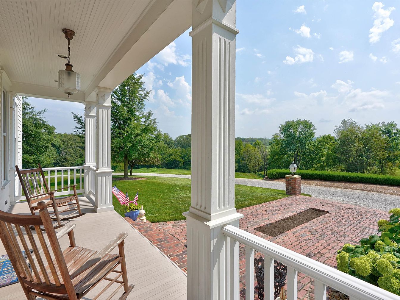 A spacious front porch with white wooden columns and a detailed beadboard ceiling creates a welcoming entry. Two weathered wooden rocking chairs are positioned to face the yard, evoking a sense of relaxation. The porch overlooks a red brick walkway bordered by lush green grass and landscaping, including neatly trimmed hedges and blooming hydrangeas. A pair of American flags stand near the entryway, and classic lantern-style light fixtures hang from the ceiling. The scene opens up to a serene rural vista, with large trees and a gravel driveway framed by manicured lawns under a bright blue sky.