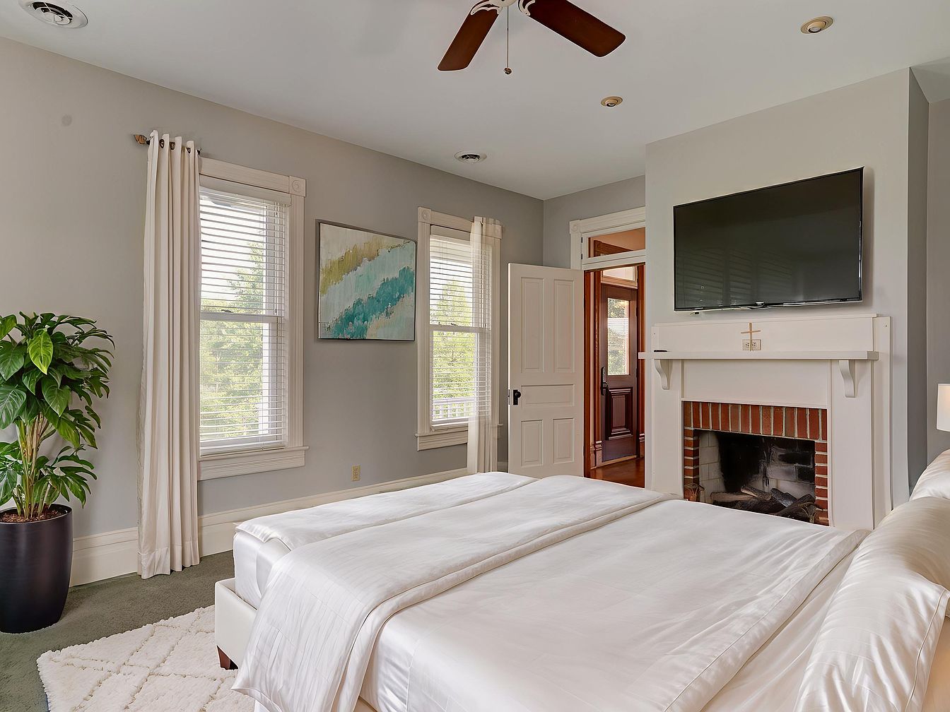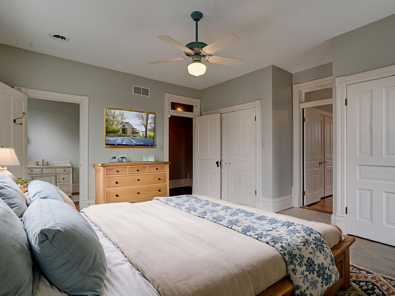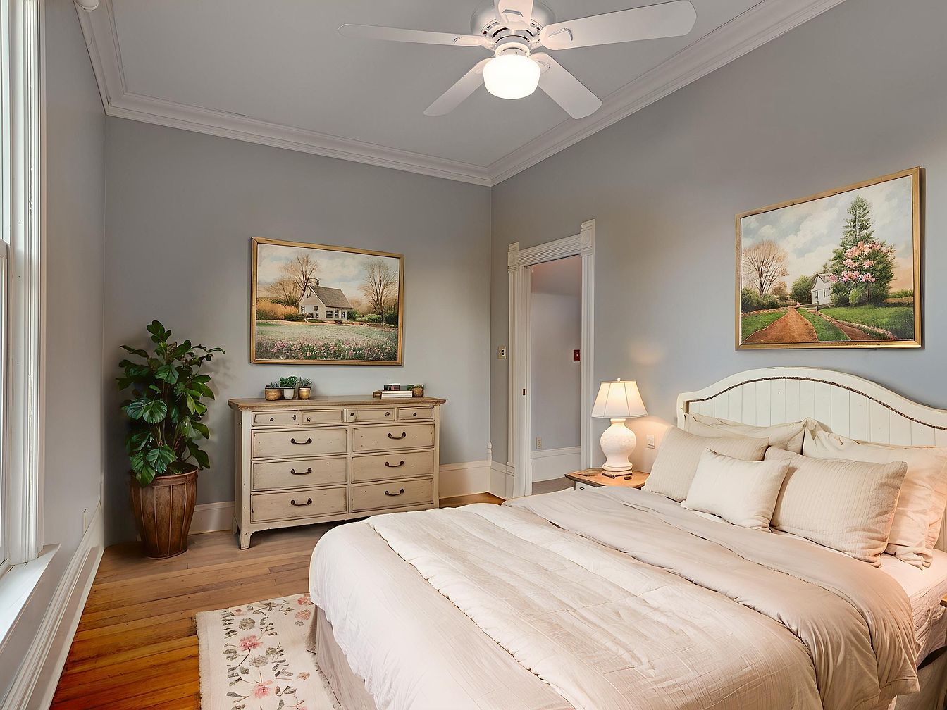 A serene bedroom features soft gray walls and crisp white trim, creating an airy and calm atmosphere. A wooden bed with pale blue and beige bedding faces a natural wood dresser topped with small essentials and decor. Above the dresser hangs a framed landscape artwork, adding a touch of artful charm. Doors with detailed molding open to adjacent rooms and a closet, enhancing the historic character. A modern ceiling fan with a light fixture hangs overhead. Subtle accents like a table lamp, small potted plant, and a patterned throw complete the tranquil, welcoming space.