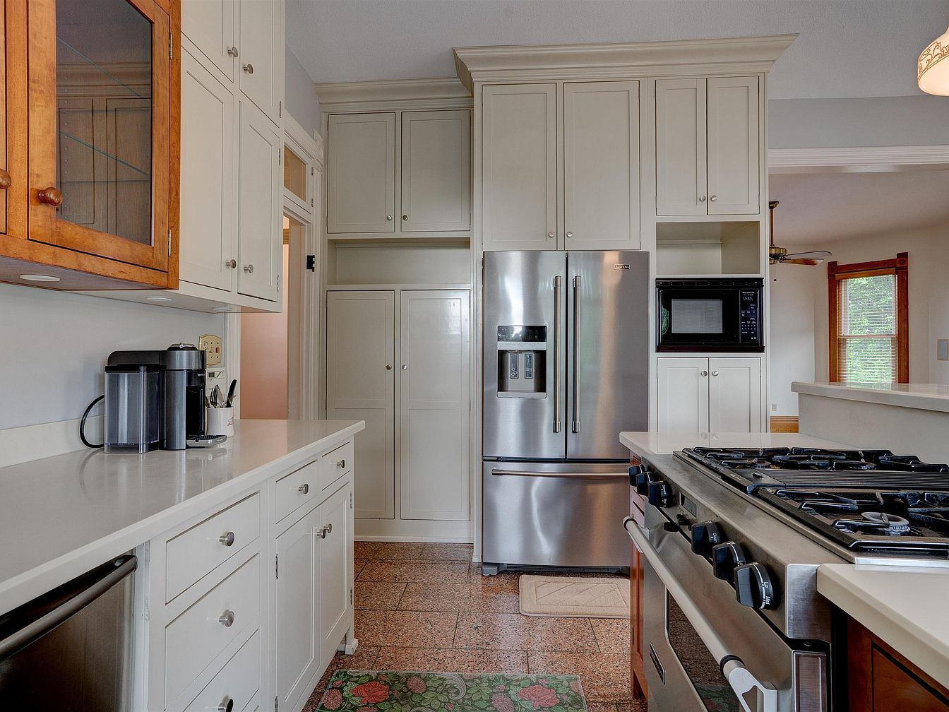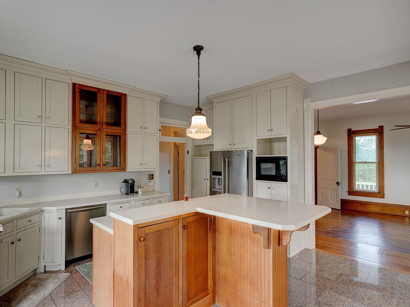 This spacious kitchen features a central island with warm wood cabinetry under a white countertop, contrasting with the surrounding vintage-inspired white cabinets. Overhead, two pendant lights cast a soft glow, reinforcing a classic, inviting atmosphere. Cabinet doors include a set with glass panels framed in darker wood, adding visual interest and a hint of historic charm. Stainless steel appliances—refrigerator and dishwasher—blend seamlessly. The floor is granite or stone-patterned, offering a polished, durable surface. Tall baseboards and classic molding frame the entrances, leading into an adjacent room with hardwood flooring, large windows, and wooden trim. The palette is soft and neutral, complementing period details.