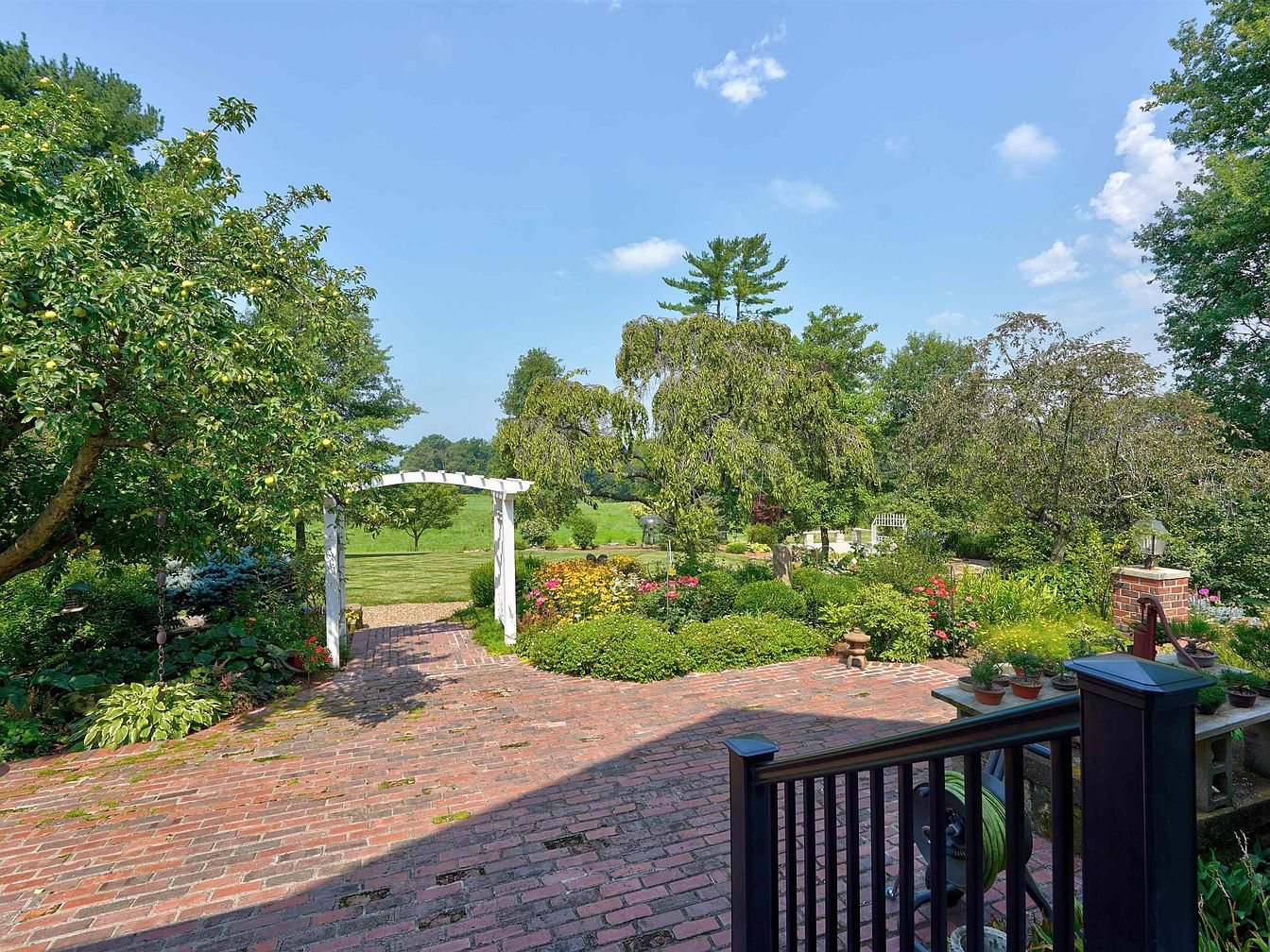 A spacious brick patio leads to a lush garden through a white wooden arbor, framing an inviting entryway. The foreground features a sturdy black railing and small potted plants, enhancing the rustic charm. On either side of the arbor, dense greenery and vibrant flowering shrubs provide bursts of color, while sprawling trees offer dappled shade. Beyond the entryway, a well-manicured lawn opens to a peaceful, picturesque landscape with additional garden beds and a traditional red brick post capped with lanterns. The open blue sky above and natural paths create an airy, tranquil atmosphere throughout the garden retreat.