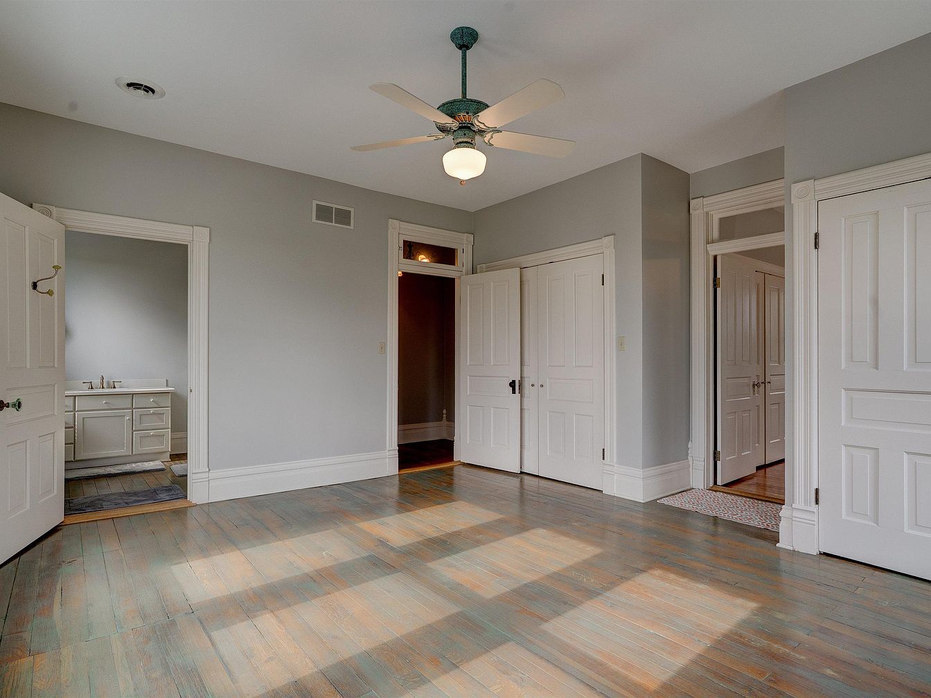 Spacious bedroom with wide-plank, lightly distressed wooden floors showing a blend of soft blue, brown, and gray tones. Pale gray walls create a calm atmosphere, paired with white crown molding and detailed baseboards. The room features multiple doors with classic white paneling and brass hardware, including double closets and entryways leading to a hallway and an adjacent bathroom with a white vanity. At the ceiling’s center, there is a green metal ceiling fan with a globe light fixture, contributing to the room’s airy, historic feel. Natural light pours in through windows just out of frame, creating a serene ambiance.
