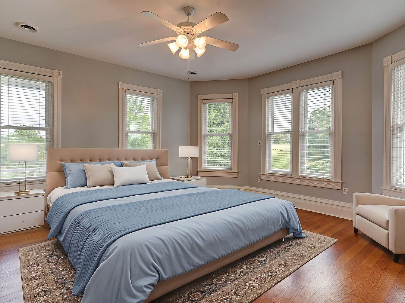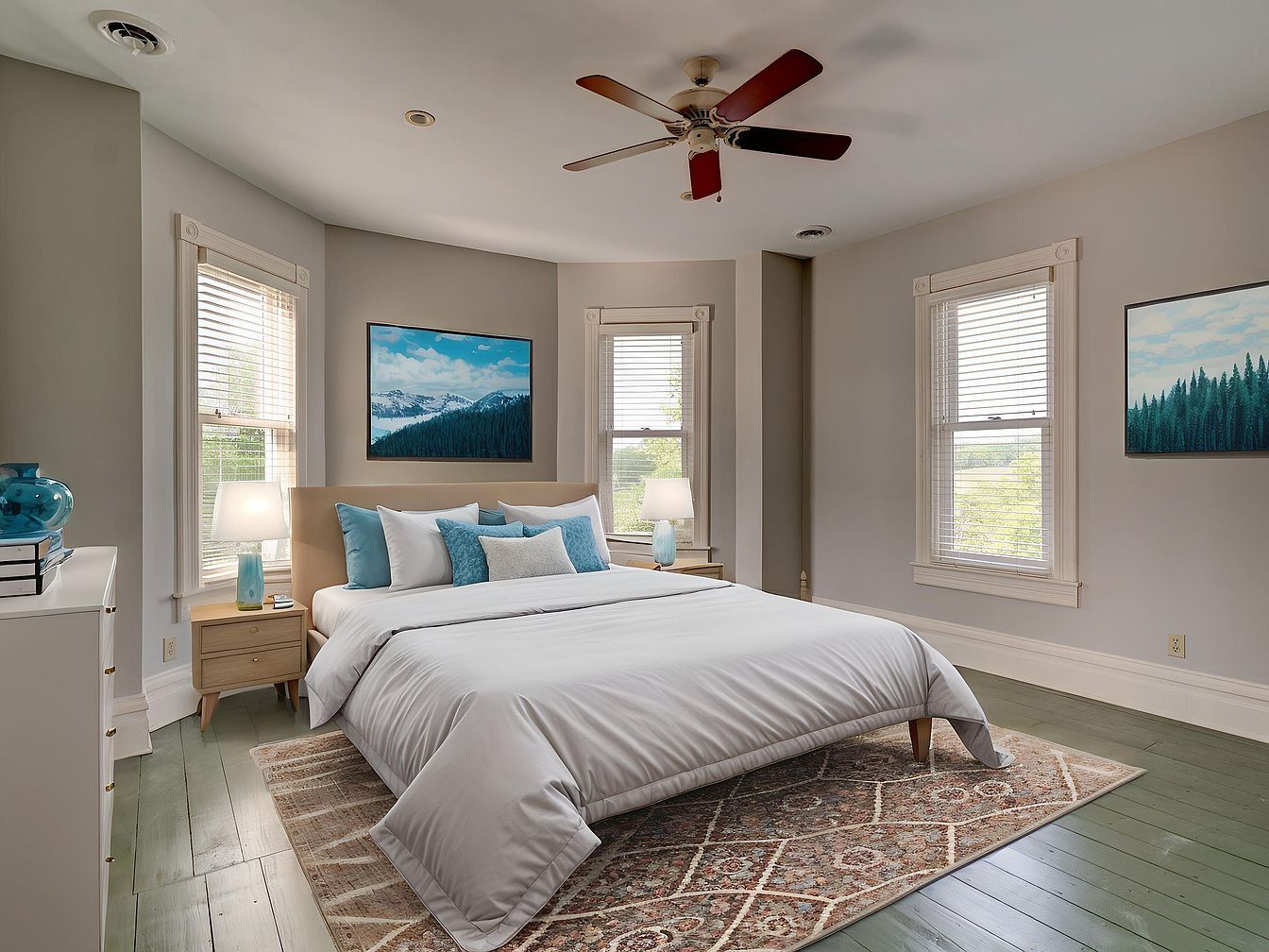 Spacious and serene, this bedroom features light gray walls and wide-plank hardwood floors, with crown molding and trim around five large windows that wrap around a corner for abundant natural light. The centerpiece is a king-sized, tufted beige platform bed dressed in blue and white linens, flanked by two modern white nightstands with sleek brass lamps. A neutral, patterned area rug grounds the space, while a cream armchair sits in the corner. The ceiling fan with soft lighting adds comfort, completing the room’s calm and tasteful aesthetic with a blend of traditional and contemporary style.