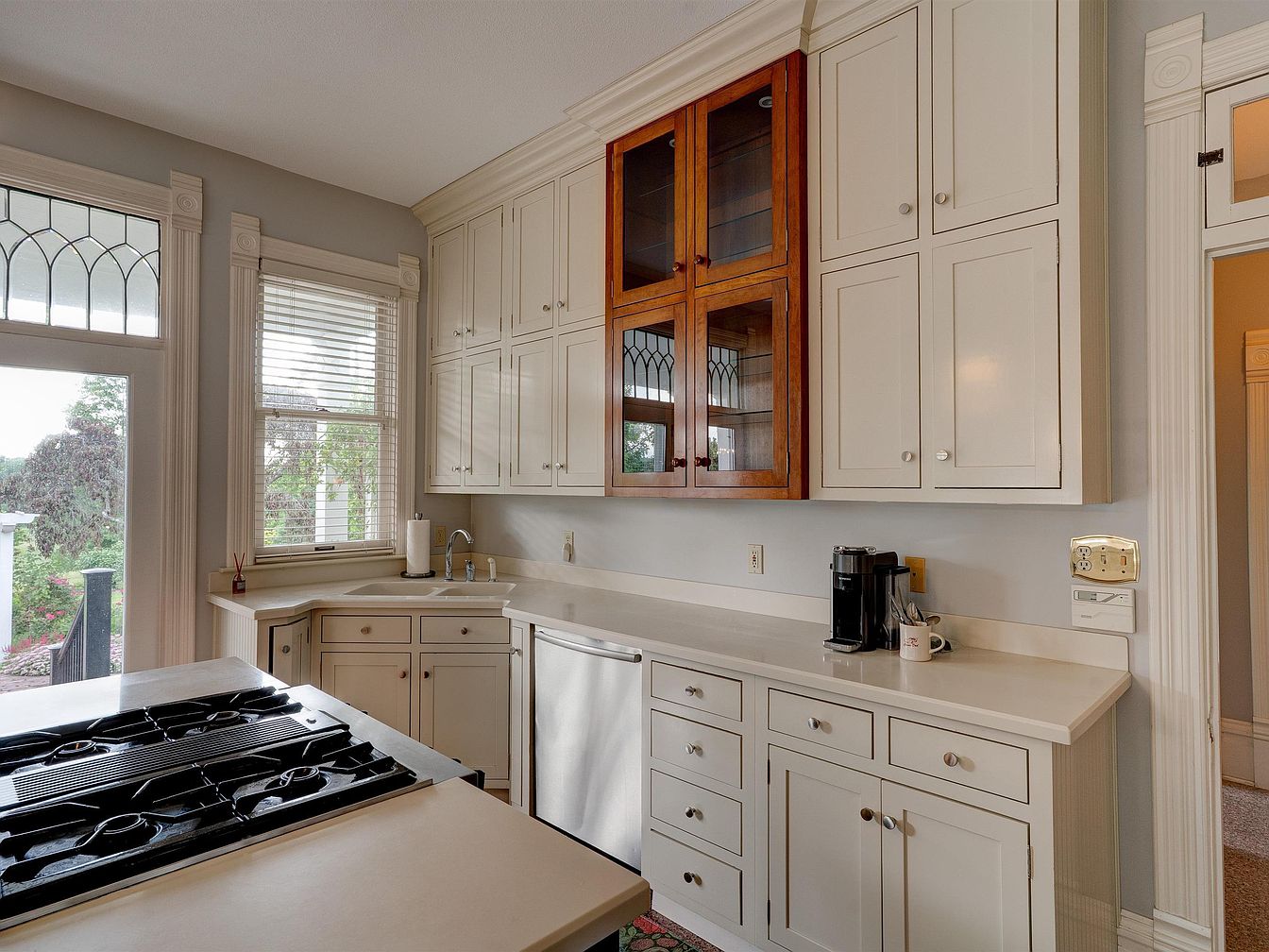 A bright kitchen corner featuring ivory-painted shaker cabinets with simple metal knobs, both above and below the marble-look countertops. A tall bank of upper cabinets is distinguished by two glass-front wooden cabinets with a warm, natural finish and geometric leaded glass details, adding historic charm. Natural light spills in from a large window over the corner sink, with classic molding frames and a view of a lush garden outside. An integrated dishwasher, black gas cooktop, single-cup coffee brewer, and neatly arranged accessories enhance the workspace, while detailed trim and crown molding add architectural character to the room.