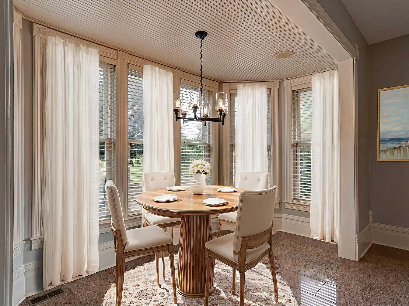 A cozy and intimate dining nook is arranged in a rounded bay with tall windows, each adorned with sheer white curtains that gently filter the sunlight. Four cream-upholstered chairs surround a round wooden table set with four simple white plates and a floral centerpiece in the middle, suggesting a peaceful spot for morning meals or tea. The ceiling features subtle beadboard paneling, complemented by a modern black chandelier overhead. Walls are painted a soft gray, matching the tranquil color scheme and elegant crown molding. The light, patterned rug beneath the table adds warmth and texture to the space.