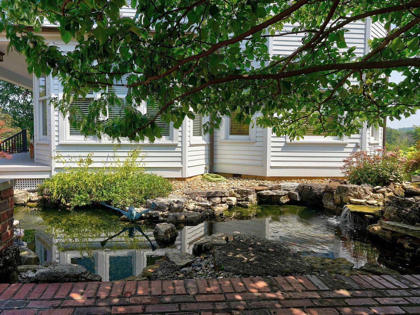 A serene garden pond sits adjacent to the white-paneled exterior of a historic home, partially shaded by a leafy tree overhead. The pond incorporates natural stone borders and features small cascades that create gentle water movement. Brick pavers form a tidy foreground edge, blending with lush greenery, ornamental plants, and a decorative bird sculpture within the water. Multiple windows along the house bring in light, while neat landscaping with gravel and shrubbery completes the setting. The overall aesthetic is tranquil and inviting, merging natural elements with the home’s classic architecture for a peaceful outdoor retreat.