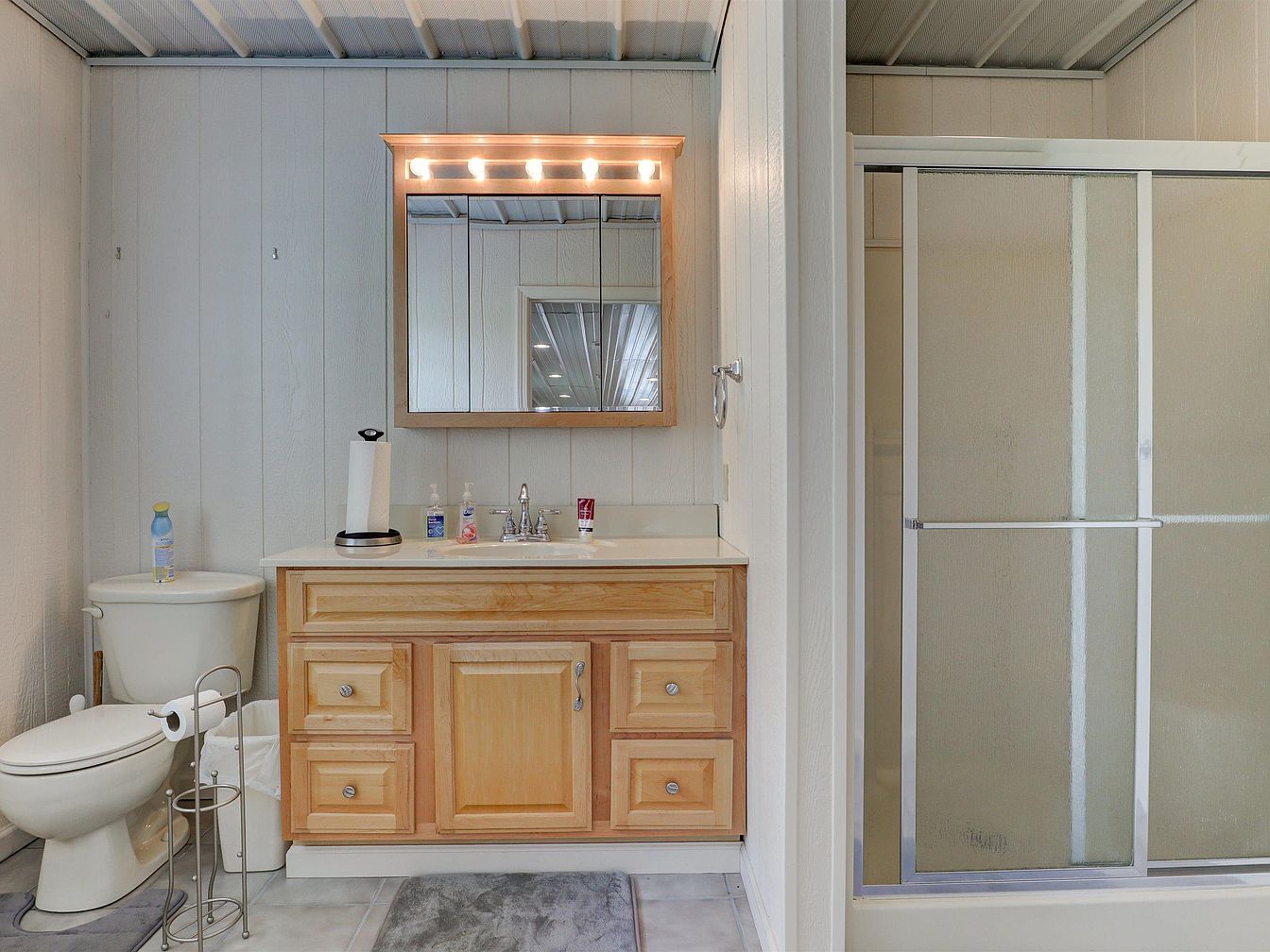 A bright bathroom features a light wood vanity with a cream countertop, double-handled faucet, and four drawers and two cabinets for storage. Above the vanity hangs a large mirror with a wide wooden frame, topped with a row of illuminated bulbs that provide even lighting. To the left, a white toilet with a paper holder and nearby wastebasket sits against a wall of vertical whitewashed wood paneling, coordinating with the neutral tile floor. On the right is a spacious shower with frosted glass sliding doors framed in silver, contributing to a clean, functional, and minimalist atmosphere.