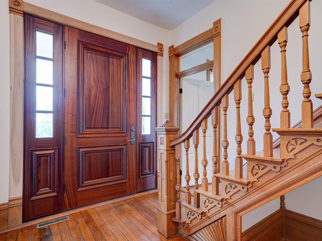 Warmly polished hardwood dominates the scene, from the solid, paneled front door in rich chestnut hues to the detailed banister and stairway trim. Vertical glass windows flank the door, letting in ample natural light. The staircase rises to the right, its balusters finely turned and the staircase skirt adorned with ornate scrollwork, evoking classic Victorian craftsmanship. Baseboards and trim feature carved rosette accents, framing wide white walls that brighten the space. The overall atmosphere is both inviting and stately, with architectural details beautifully preserved to evoke a sense of historic elegance and warmth immediately upon entry.