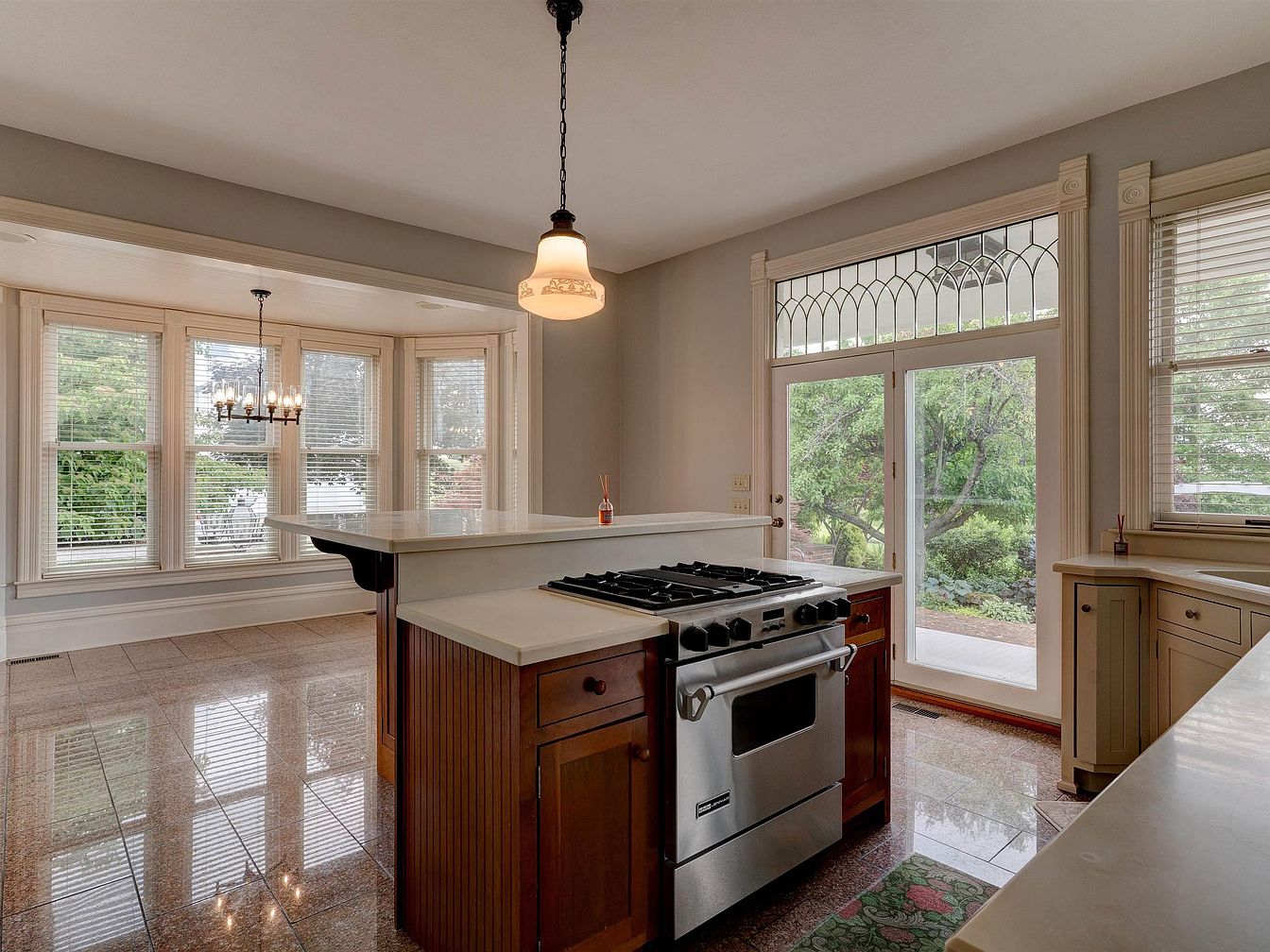 Spacious kitchen area featuring a central cooking island with a stainless steel gas range and white countertops. Natural light floods the room through large windows and a set of glass French doors, which offer a view of lush greenery outside. The backsplash and cabinetry are in muted cream and warm wood tones, blending with the highly polished stone floor tiles. An ornate pendant light hangs above the island, while a classic chandelier sits above a neighboring breakfast nook. The millwork trim around the windows and doors displays elegant craftsmanship typical of historic American homes.