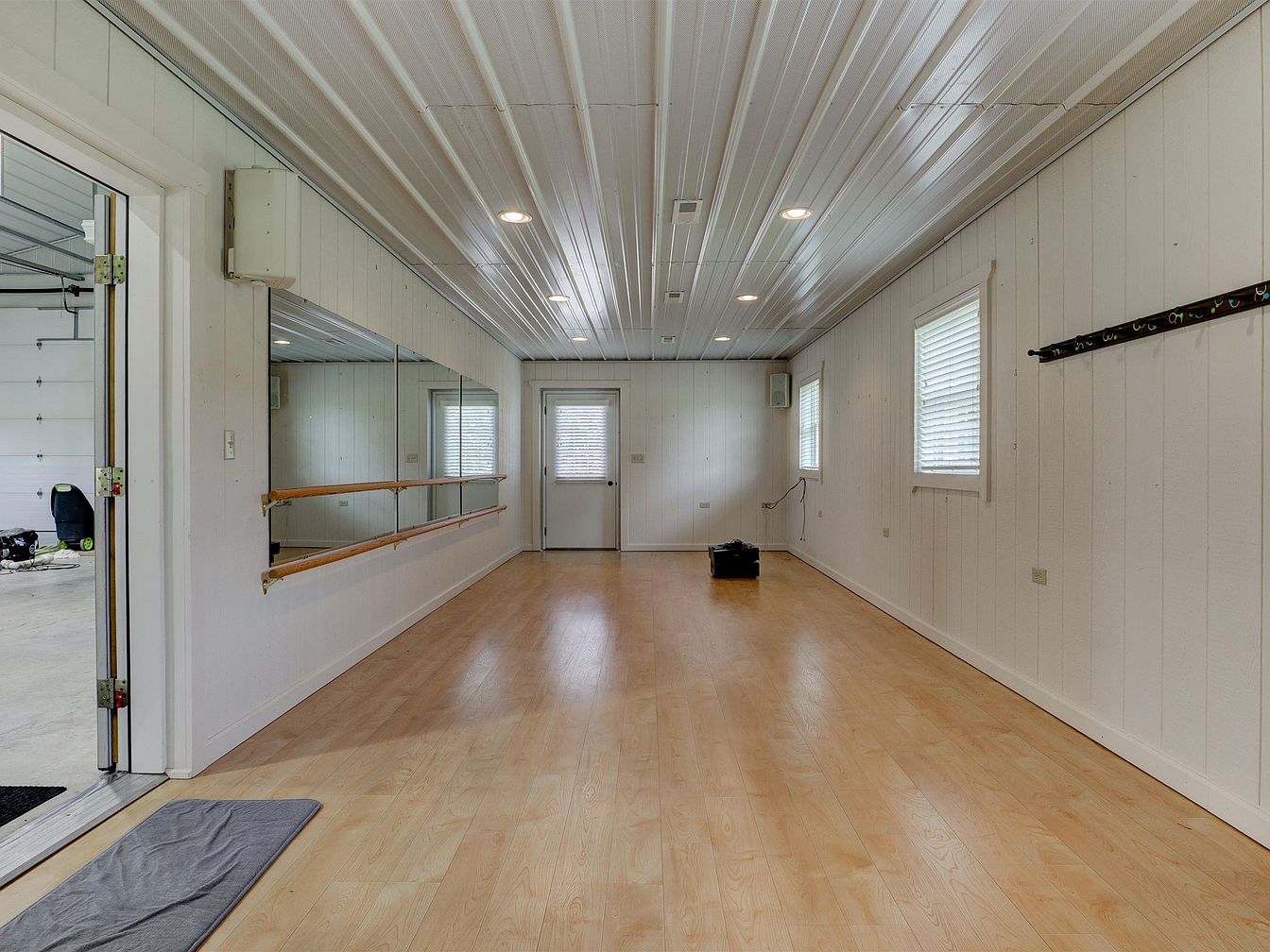 A long, narrow room with light wood laminate flooring and white paneled walls, designed as a dance or exercise studio. The left wall features a large horizontal mirror with a wooden ballet barre attached for stretching or dance practice. The ceiling is finished with white metallic panels and recessed lighting, providing an even, bright illumination. Two windows with white blinds line the right wall, letting in natural light. At the back is a single door with a window, and there is a black equipment box on the floor. The overall aesthetic is clean, functional, and minimal, ideal for movement and training.