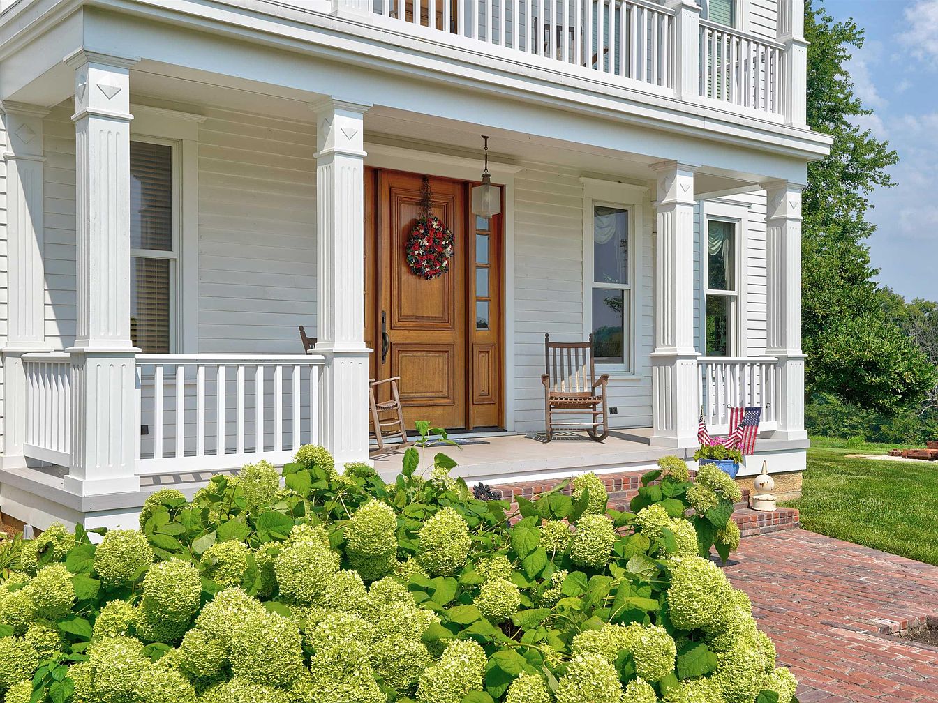 A classic white-painted front porch features prominent fluted columns with decorative trim and boxed bases supporting a covered area. The wooden double front door, adorned with a vibrant red floral wreath, serves as a welcoming focal point. Two traditional rocking chairs are positioned on either side of the entryway, evoking timeless Southern hospitality. The porch railing and posts have clean, elegant lines, while the brick pathway and steps provide visual warmth and a rustic touch. Lush green hydrangea bushes fill the foreground, and small American flags add a touch of historic Americana beside manicured lawn and mature shade trees in the background.