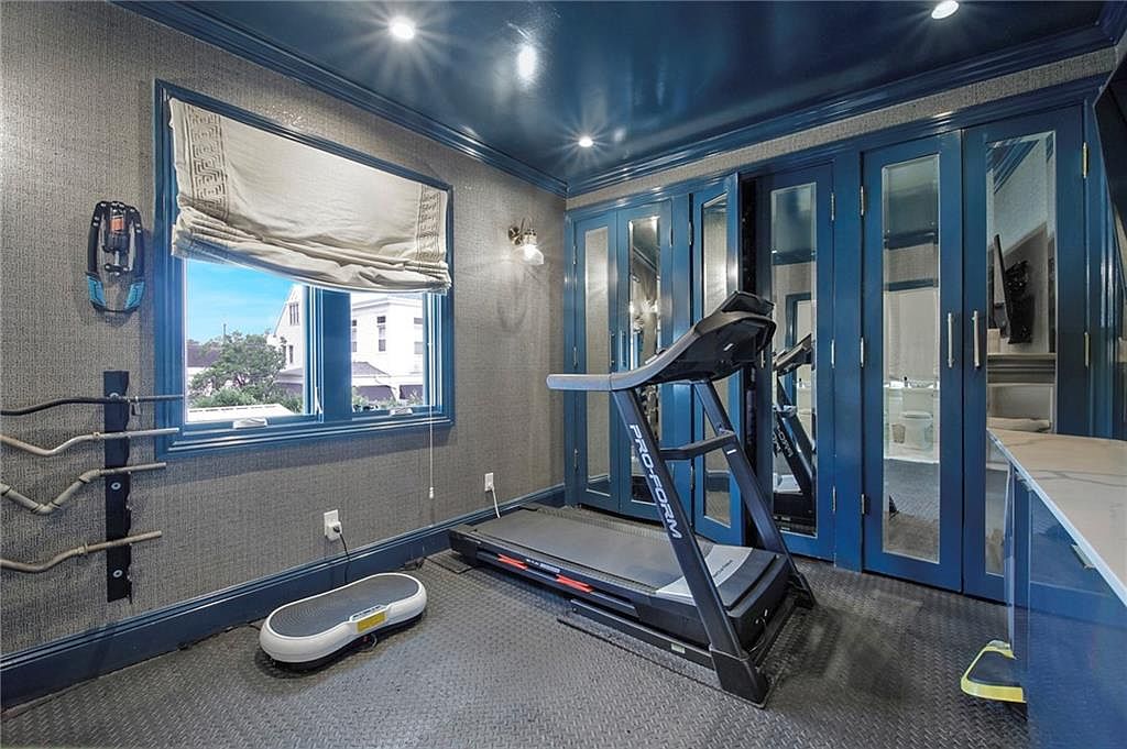 A compact fitness room featuring a treadmill centered on a dark textured rubber floor for easy cleaning and stability. The walls are covered in gray fabric wallpaper, creating a soft, insulated feel, while the ceiling and trim are finished in a deep gloss blue, providing a modern contrast. Blue mirrored cabinets line one wall, reflecting light from recessed ceiling fixtures and visually enlarging the space. A large window with a Roman shade admits natural light and offers an outdoor view. Additional exercise equipment is mounted on one wall, and a white workout step platform sits nearby, complementing the gym’s functional design.
