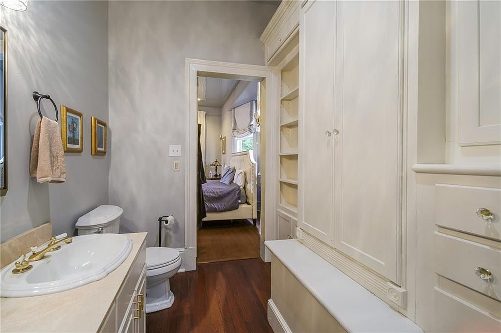 A narrow bathroom area with elegant built-in cabinetry and open shelving in a creamy white finish lines the right wall, offering ample storage space. To the left, a marble-topped vanity with a porcelain basin and gold-toned fixtures sits beside a white toilet. Above the vanity are framed artworks in gold frames, and a towel ring with a soft beige towel. The walls are painted a soft, cool gray, complementing the warmth of the rich, polished wood floor. Through the open doorway straight ahead, a glimpse of a cozy bedroom with a tufted headboard and light, patterned linens can be seen.