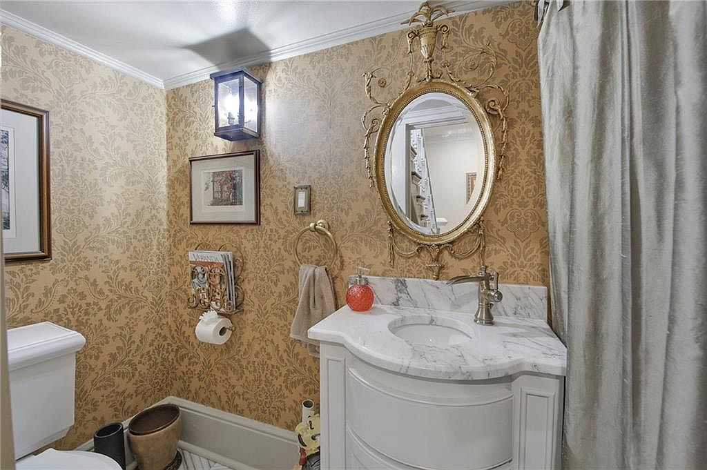 An intimate powder room with elegant, historical charm. The space features ornate gold damask wallpaper that covers the walls, creating a lush, classic atmosphere. A white marble-topped vanity with curved cabinetry stands against one wall, topped with a vintage-inspired brushed nickel faucet. A striking, gilded oval mirror with intricate detailing hangs above the vanity, adding to the room’s opulence. The toilet stands in the corner, accented by framed artwork. There is a magazine rack and neatly placed towel ring. Soft, neutral curtains hang on the right, and a lantern-style ceiling light fixture offers a warm, inviting glow.