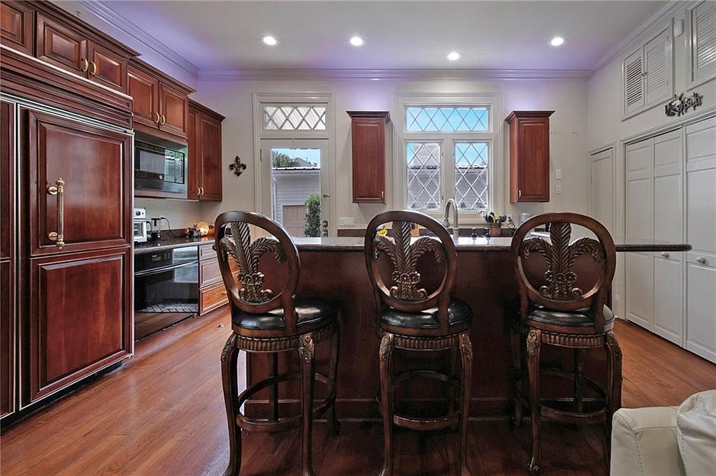 Rich wood cabinetry and detailed trim evoke a sense of classic elegance in this kitchen. The large kitchen island features three ornate, dark wood barstools with carved backs and plush black seats. Warm wooden floors complement the cabinetry, creating a cohesive look throughout the room. Twin windows with diamond-patterned glass invite natural light into the space, flanked by matching cabinetry on either side. Subtle crown molding at the ceiling edge adds sophistication. Stainless steel appliances and discreet lighting above the island provide both modern function and ambiance. Ample counter space and built-in storage underscore practicality in the design.
