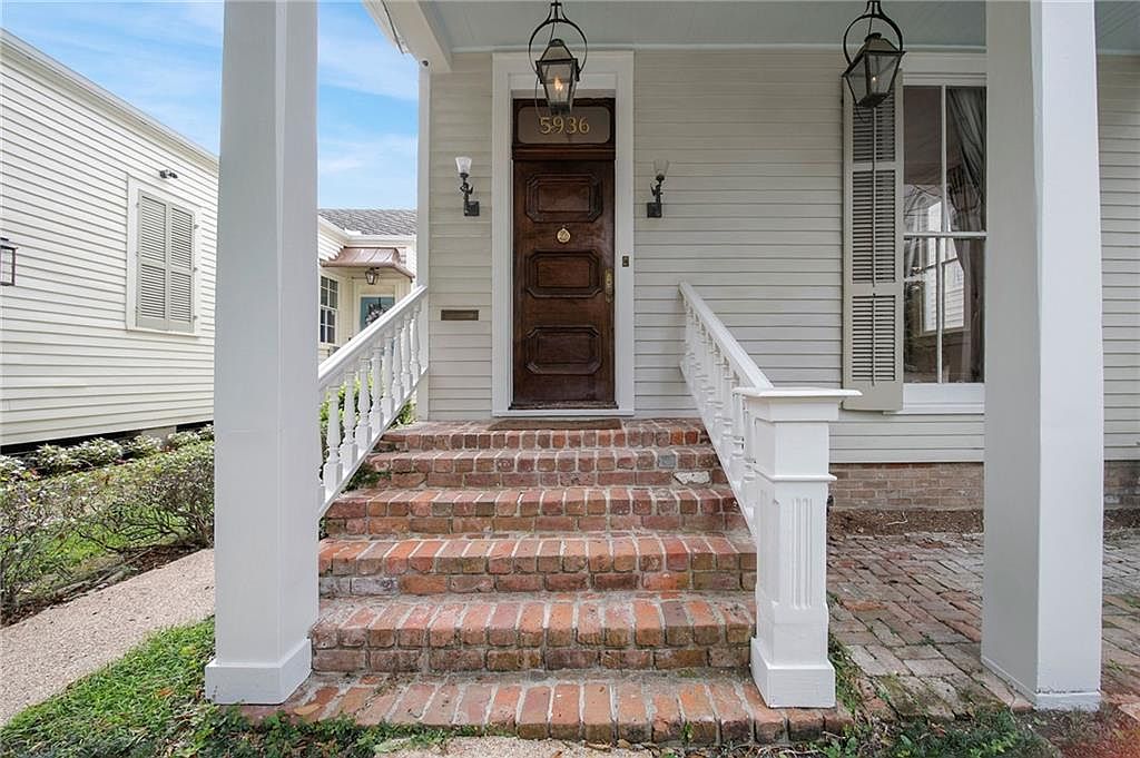 A raised brick staircase leads to the entryway of a historic home. The porch features white wooden railings with decorative balusters on either side, framing a dark, ornate wooden front door with a brass knocker and the number 5936 above. Two classic lantern-style pendant lights hang from the ceiling, complementing the period architecture. The siding is painted a soft white, and large windows with light-gray shutters stand to the right of the entrance, one partially open, revealing draped curtains inside. Red bricks line the porch floor and pathway, surrounded by manicured flower beds and trimmed greenery.