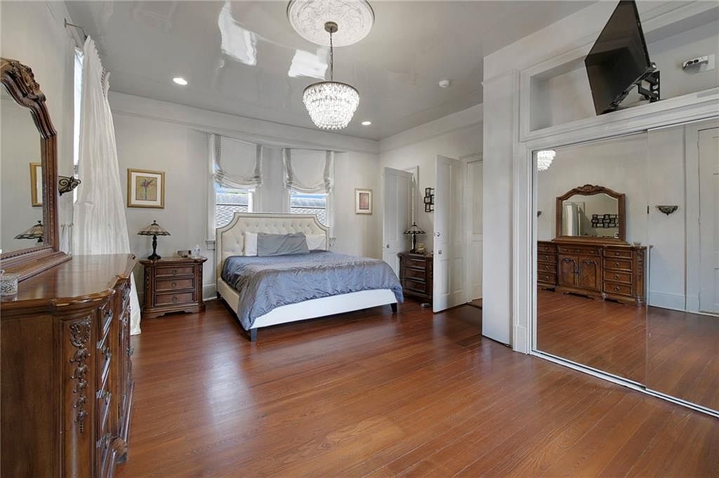Spacious bedroom featuring polished wood floors and a soft, neutral color palette with pale gray walls and ceiling. A large bed with a tufted headboard is centrally placed between two windows dressed in light, ruched curtains. Ornate dark-wood dressers and matching nightstands add a touch of historic charm, complemented by vintage-styled table lamps. A crystal chandelier provides a touch of luxury, its sparkle echoed in the mirrored closet doors along one wall. An angled TV is mounted above the closet. Artwork and decorative touches complete a comfortable yet sophisticated setting.