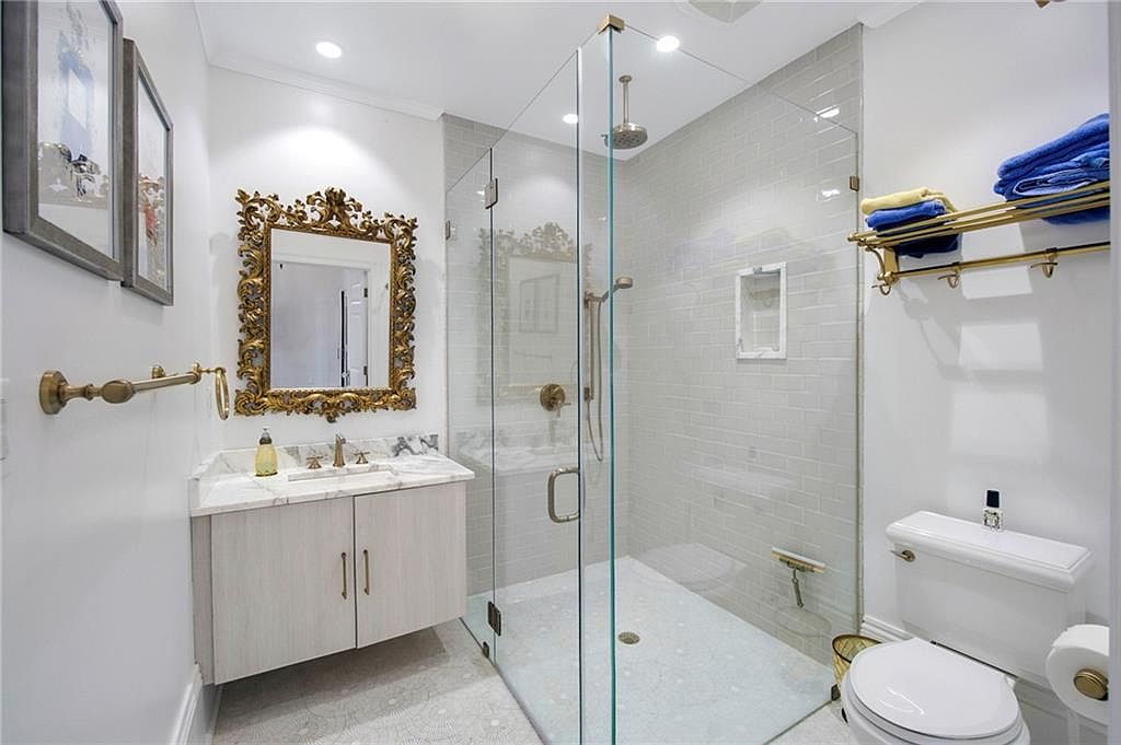 A spacious bathroom featuring a frameless glass shower with a rainfall showerhead sits along a wall clad in glossy, light-gray subway tiles. To the left, a white marble-topped vanity with pale wood cabinets is paired with a striking, ornate gold-framed mirror. Brass fixtures and towel bars add warmth and a vintage touch, complementing the mirror’s detailed carving. Open shelving above the toilet holds neatly folded blue and yellow towels. Soft gray floor tiles contribute to a bright and airy ambiance, while recessed ceiling lights ensure the room feels fresh and well-lit. Framed art accents the walls.