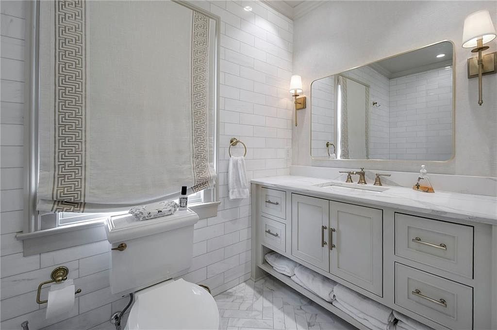 A serene bathroom features a dual-sink vanity with a marble countertop and soft grey cabinetry, accented by brass hardware and fixtures. Above the sinks is a large, rectangular mirror with rounded corners, framed in gold, flanked by wall-mounted sconces providing warm lighting. The walls and floor are adorned with white subway tiles, arranged in a herringbone pattern on the floor and stacked horizontally on the walls, enhancing the classic style. A window with a cream Roman shade featuring a Greek key border completes the look. Neatly rolled white towels are stacked on the open shelf below the vanity, maintaining a tidy, elegant feel.