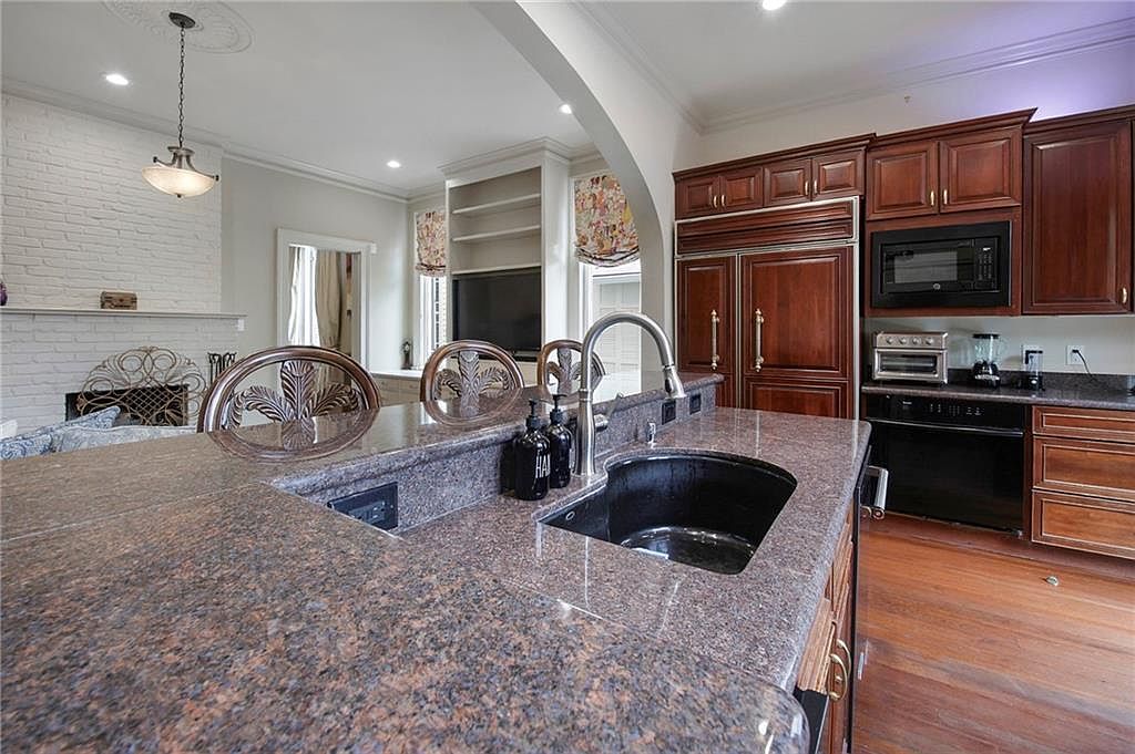 A spacious kitchen with a large granite countertop island featuring an undermount sink and stainless steel faucet. Ornate bar stools with intricate backs line the counter, looking out toward an adjacent living area. The kitchen cabinets are a rich, deep wood tone with gleaming brass hardware, contributing to a classic, upscale feel. The appliances, including a built-in oven, microwave, and refrigerator, are seamlessly integrated, with paneling matching the wood cabinetry. Warm hardwood floors complement the cabinetry, while neutral wall colors maintain a light and airy ambiance. An archway visually connects the kitchen to a cozy sitting area featuring a white brick accent wall and built-in shelving.