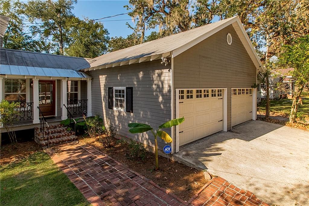 A concrete driveway leads up to a two-car garage with cream-colored paneled doors accented by small windows at the top. The garage is attached to a historic home, featuring gray wood siding and white trim. A brick walkway bordered by manicured garden beds connects the driveway to the home’s front porch, which is elevated with four white columns and ornate black iron railings. Steps with rustic brick pavers lead to a wooden front door. The yard is lush and partially shaded by mature trees, lending a welcoming, Southern charm to the overall aesthetic.