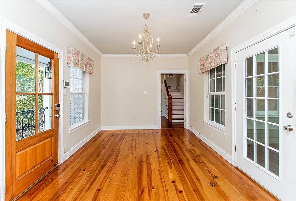 A bright entryway featuring honey-toned polished hardwood floors stretches from the front door to an interior doorway. Light beige walls, accented by crisp white crown molding and baseboards, add a timeless elegance. On the left, a wooden door with glass panes opens onto a porch with wrought-iron railings, letting in abundant natural light. To the right, a matching glass-paned door leads to another part of the house. Two windows with delicate patterned Roman shades line the side wall. A simple chandelier hangs from the ceiling, offering a touch of classic charm above the uncluttered space.