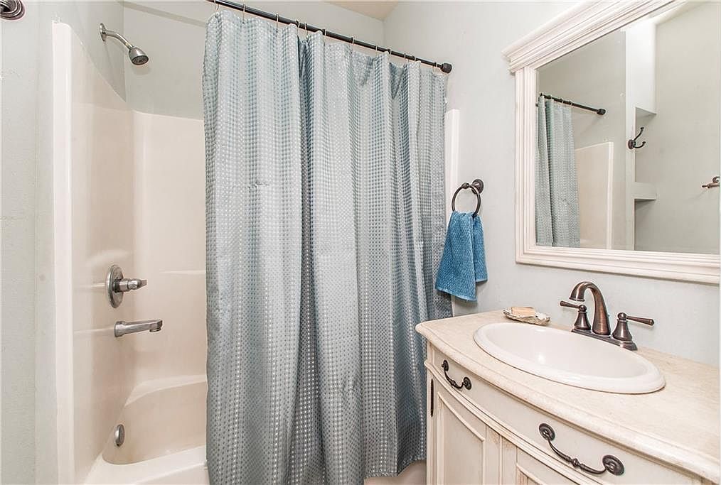 A compact bathroom featuring a curved cream vanity with dark bronze fixtures and a matching framed mirror above. To the left is a white tub and shower combination, accented with a pale blue, patterned shower curtain hanging from a simple metal rod. Walls are painted a soft pastel tone that harmonizes with the curtain. The vanity top holds a soap dish, and a hand towel in blue hangs from a small bronze ring. The overall atmosphere is light and airy, combining traditional touches with clean lines and a soft, neutral color palette for a calming, welcoming effect.