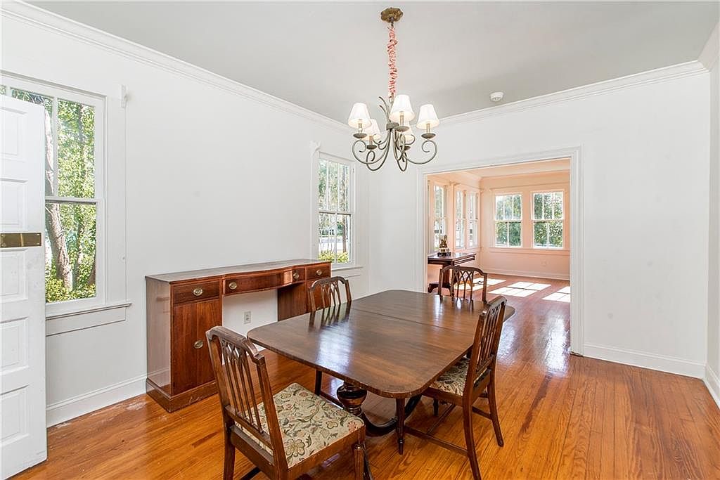 A bright, airy dining room with honey-toned hardwood flooring sets a warm and inviting tone. The space features a wooden dining table with four matching chairs, each with patterned cushions. Against one wall, a vintage wooden sideboard provides a touch of traditional elegance. Two large sash windows allow plenty of natural light, illuminating the crisp white walls and ornate crown molding. A decorative wrought-iron chandelier hangs from the ceiling, adding classic charm. Through a wide doorway, a sun-drenched adjoining room is visible, further enhancing the open, connected layout and highlighting the home’s historic character.