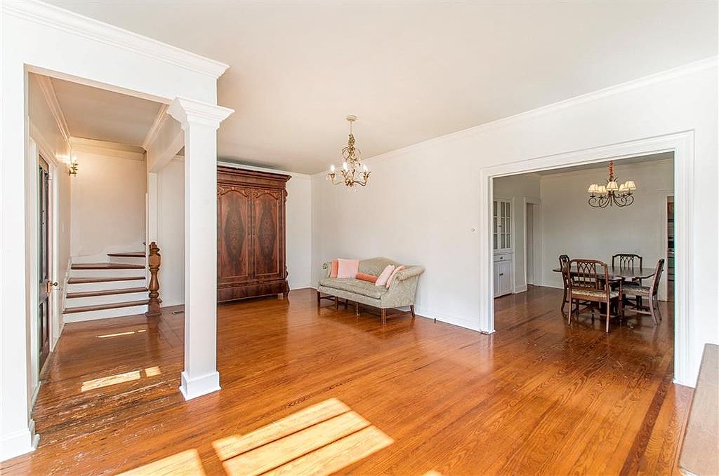 A spacious living room filled with natural light from large windows, featuring warm, gleaming hardwood floors that continue throughout. The color palette is classic with crisp white walls and bright trim, enhancing the sense of openness. In the center hangs an ornate brass chandelier, adding historic charm. Against one wall stands a sizeable, dark wood armoire with decorative grain detail, paired with a small vintage sofa adorned with pastel pillows. Wide doorway openings connect to an adjacent dining area with a matching chandelier and dark wooden table, while a set of stairs with a carved newel post leads upward, framed by stately white columns.