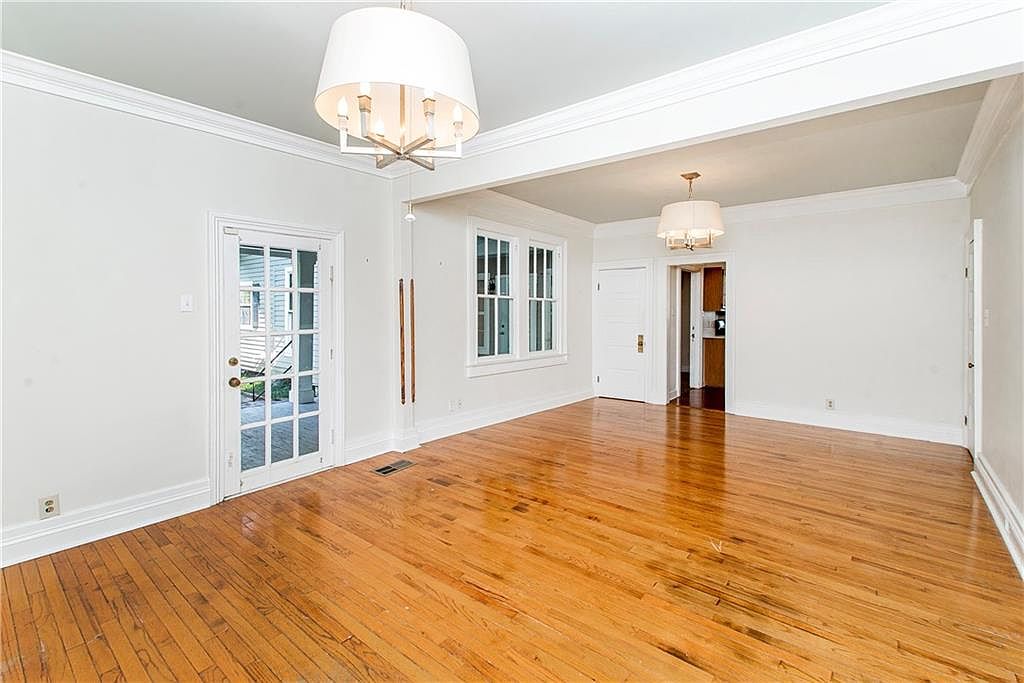 A bright, open dining area features polished hardwood floors and soft white walls adorned with thick crown molding. Large windows and a set of glass-paneled French doors provide abundant natural light and a view to the outdoors. Two matching contemporary chandeliers hang from the ceiling, lending a modern touch to the otherwise classic room. The spacious layout connects seamlessly to an adjacent room through a wide doorway without doors, and a smaller doorway leads to another area, likely a kitchen. Overall, the design balances traditional and modern elements, creating an airy and welcoming atmosphere.