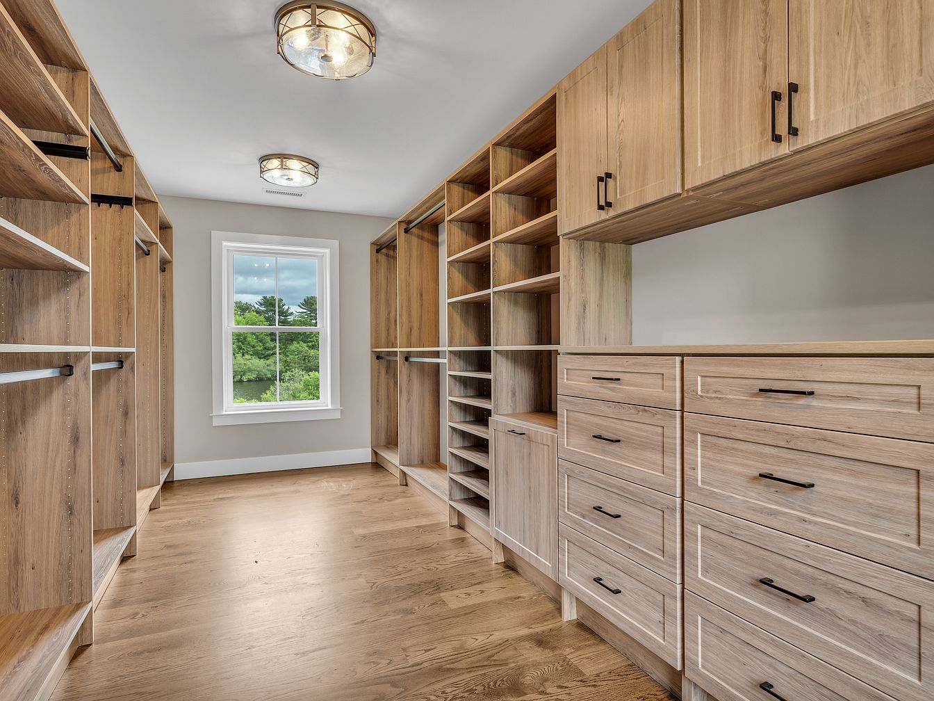 A spacious walk-in closet featuring custom wooden shelving and storage solutions. The room showcases a warm, natural color palette with rich wooden textures complemented by a light beige wall. Several open shelves provide ample space for organizing shoes and accessories, while drawers with sleek black handles offer concealed storage. A large window allows natural light to flood in, highlighting the beautiful oak flooring that adds warmth to the space. Elegant, modern light fixtures hang from the ceiling, enhancing the contemporary aesthetic while maintaining a cozy ambiance, making this closet both functional and stylish.