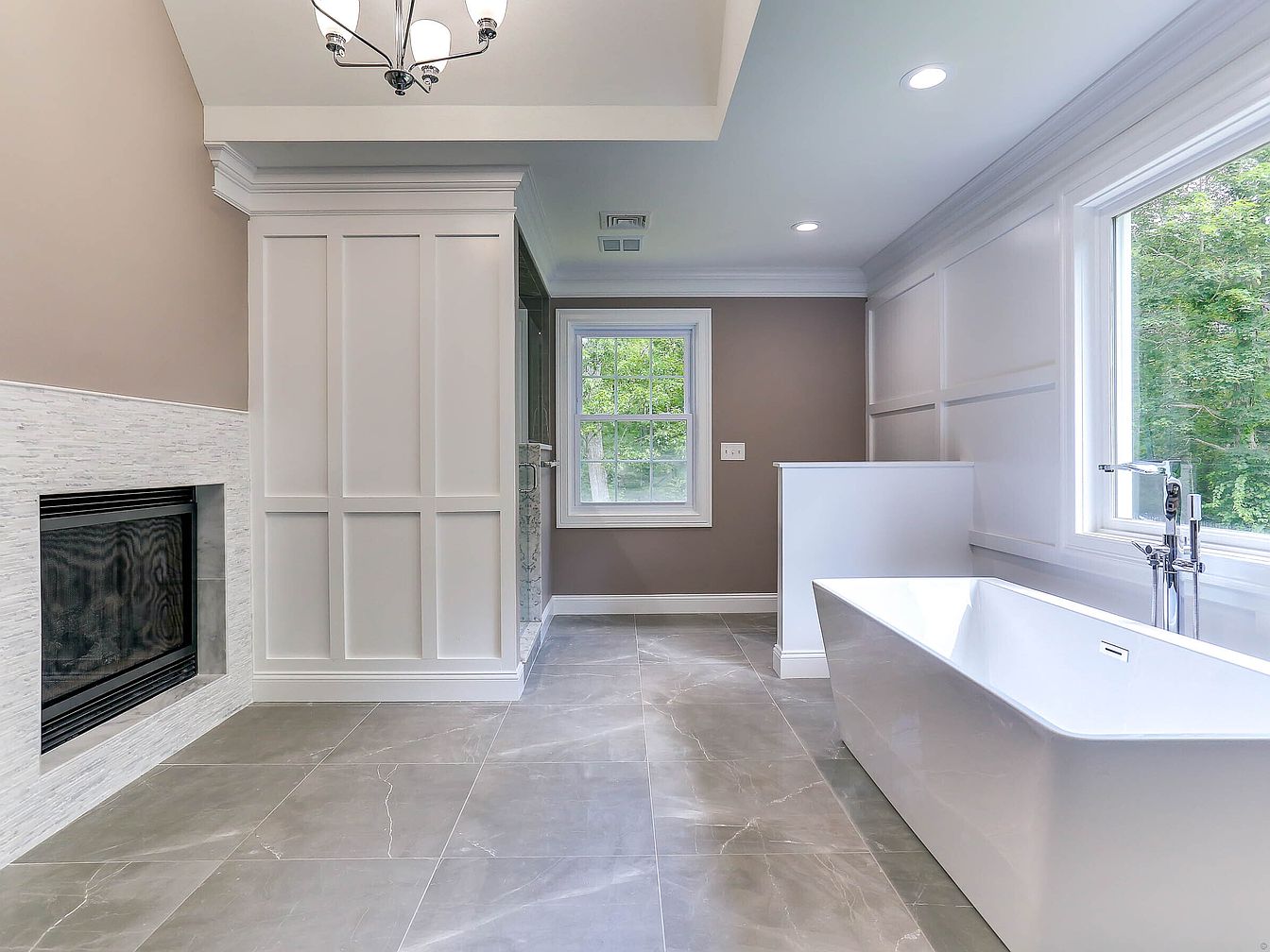 This modern bathroom features a harmonious blend of functionality and aesthetics. The space showcases a freestanding bathtub, elegantly positioned under a window, allowing natural light to illuminate the room. Soft beige walls complement the large gray tiles that cover the floor, creating a warm and inviting atmosphere. A sleek, minimalist fireplace, set into a textured white stone wall, adds a touch of luxury. The coffered ceiling enhances architectural interest, while recessed lighting ensures bright, even illumination. A modern chandelier provides a final decorative touch, embodying contemporary elegance in this tranquil retreat.