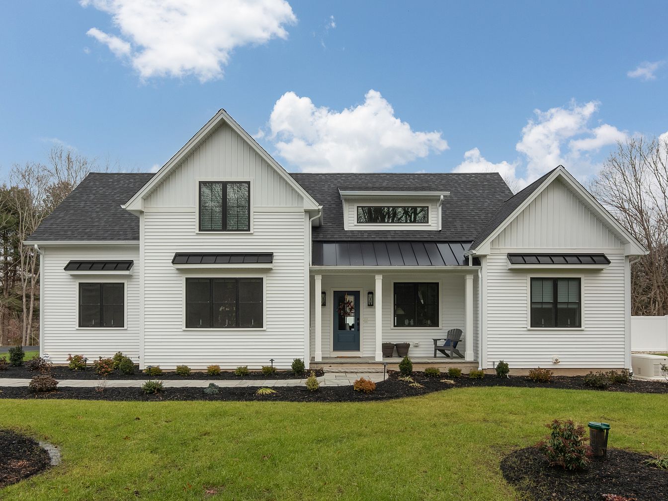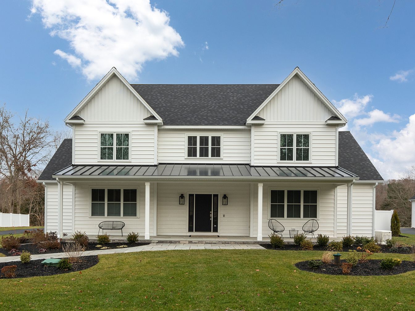 The front facade of this historic American home showcases a blend of traditional and modern design elements. A symmetrical layout features a central entrance flanked by large windows, inviting natural light. The white vertical and horizontal siding contrasts with the dark asphalt roof, creating a crisp look. A black metal roof overhang provides a contemporary touch. The neatly landscaped yard includes manicured green lawns and low-maintenance shrubs, enhancing curb appeal. Two stylish chairs on the porch add a welcoming character, while the sleek, stone pathway leads to the entrance, marrying functionality with elegance.