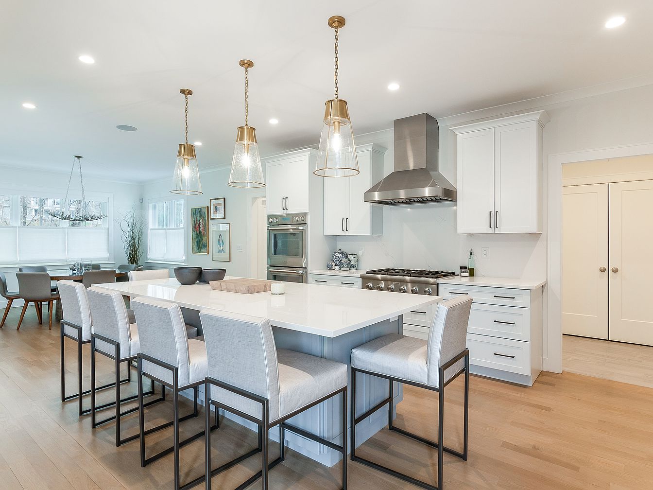 The kitchen features a large, central island with a smooth, white countertop, complemented by high-backed bar stools in a light gray upholstery and black metal frames. Pendant lights hang above the island, providing warm illumination. Glossy white cabinetry with simple black handles contrasts with a stainless-steel range and hood, highlighting a modern aesthetic. Natural light floods in through large windows adorned with sheer blinds. A subtle neutral color palette enhances the open layout, while hardwood flooring adds warmth, maintaining a clean and airy vibe that invites both cooking and socializing.