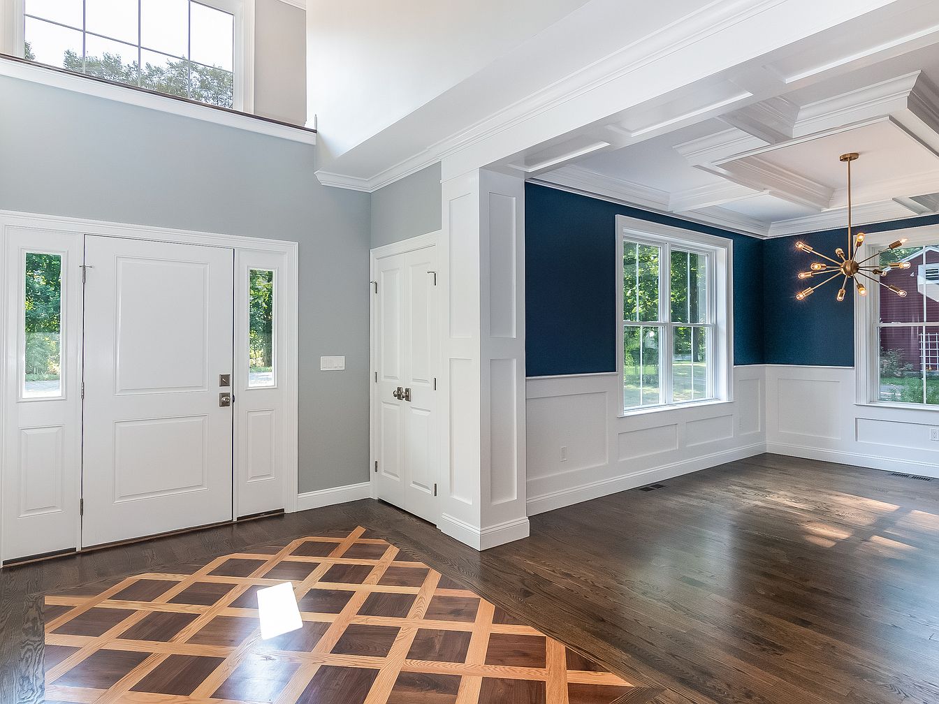 The entryway showcases a blend of classic and modern design elements. A spacious layout features a striking hardwood floor with an intricate inlay pattern, contributing a warm aesthetic. The walls are painted in soft gray, complementing the white paneling and doors, enhancing the brightness. A decorative light fixture hangs from the coffered ceiling, adding a contemporary touch. Large windows allow natural light to flood the space, highlighting the contrast between the dark floor and lighter tones of the walls. This area serves as a welcoming transition point, leading into the broader living space.