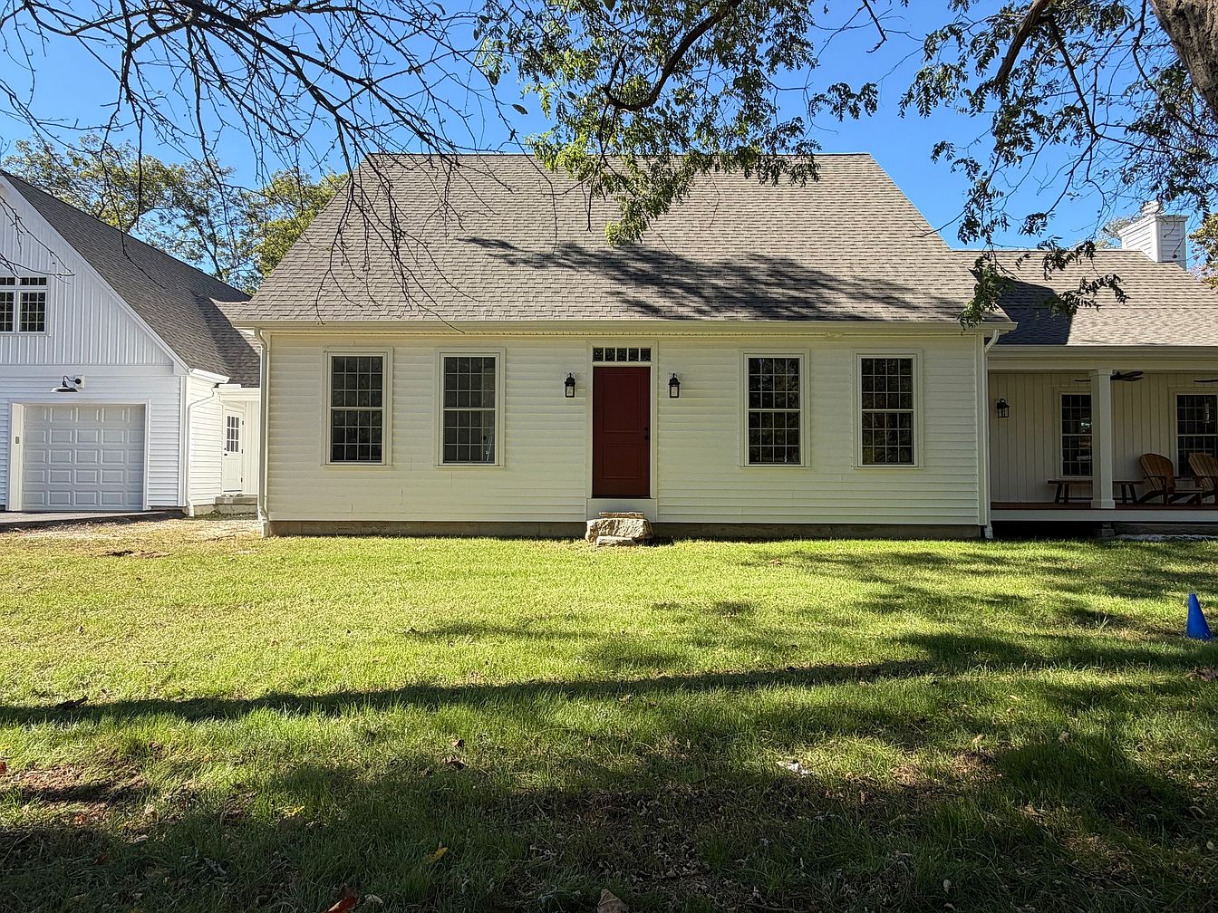 The image showcases a charming front elevation of a historic American home. A clean, symmetrical facade features a peak roof and generous dormer. The light yellow siding contrasts pleasantly with the deep red front door. Flanking the entrance, tall, multi-pane windows enhance the inviting feel, while two outdoor sconces provide gentle illumination. The surrounding lush green lawn is well-maintained, dotted with shadows from nearby trees. To the left, a spacious garage with a light exterior complements the home’s aesthetic. The overall design evokes a rustic yet refined ambiance, seamlessly blending traditional and modern elements.