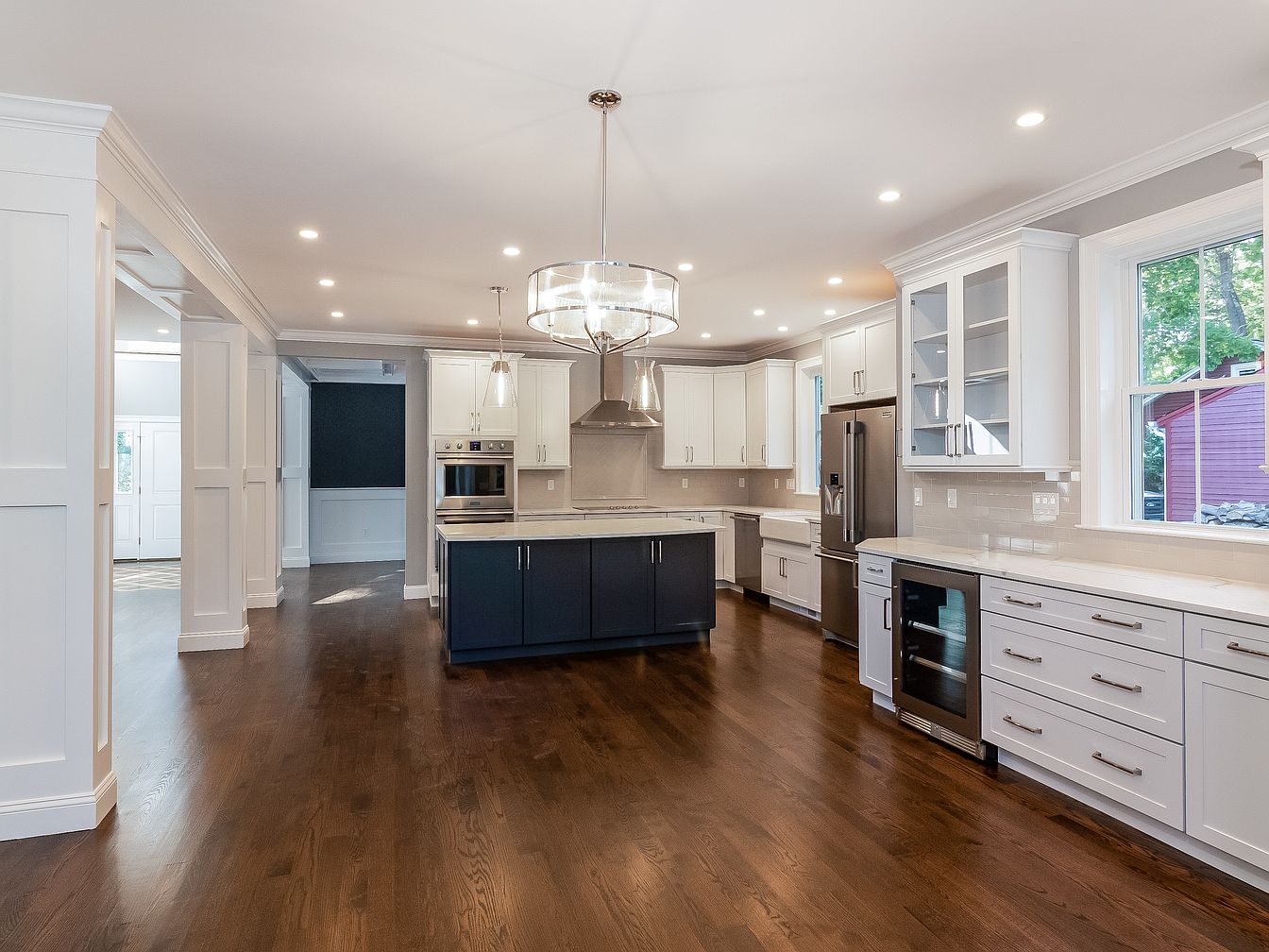 This contemporary kitchen showcases an open layout with sleek cabinetry and modern appliances. The color scheme features soft white cabinets paired with a striking navy island, creating a stylish contrast. A spacious countertop extends for ample prep space, while under-cabinet lighting enhances the functionality and ambiance. The hardwood flooring adds warmth, complemented by recessed lighting and a chic pendant fixture above the island. Large windows provide natural light, illuminating the space. Architectural details include crown molding and clean lines, blending practicality with elegance. This kitchen is designed for both cooking and social gatherings, offering a welcoming atmosphere.