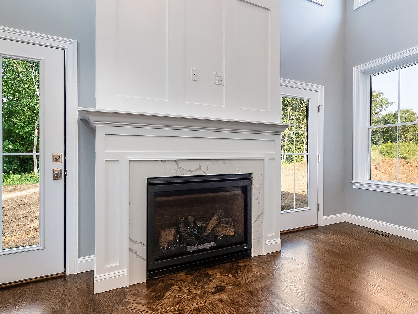 The spacious living room features a sleek fireplace set in a modern mantel that blends white paneled wood with elegant marble detailing. Light grey walls enhance the airy feel, complemented by rich, dark hardwood flooring arranged in a herringbone pattern. Large windows allow natural light to flood the space, framing picturesque views of the outdoors. A glass door provides direct access to a serene exterior, seamlessly connecting indoor and outdoor living. Minimalist electrical outlets blend unobtrusively into the wall design, reflecting a focus on clean lines and contemporary aesthetics. This space is inviting, exuding warmth and sophistication.